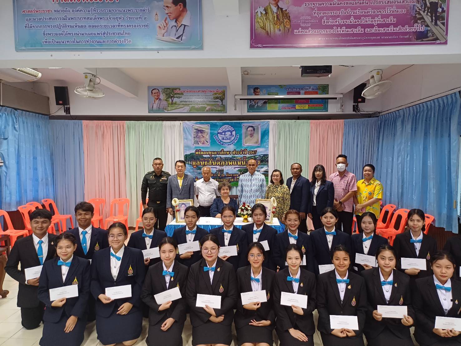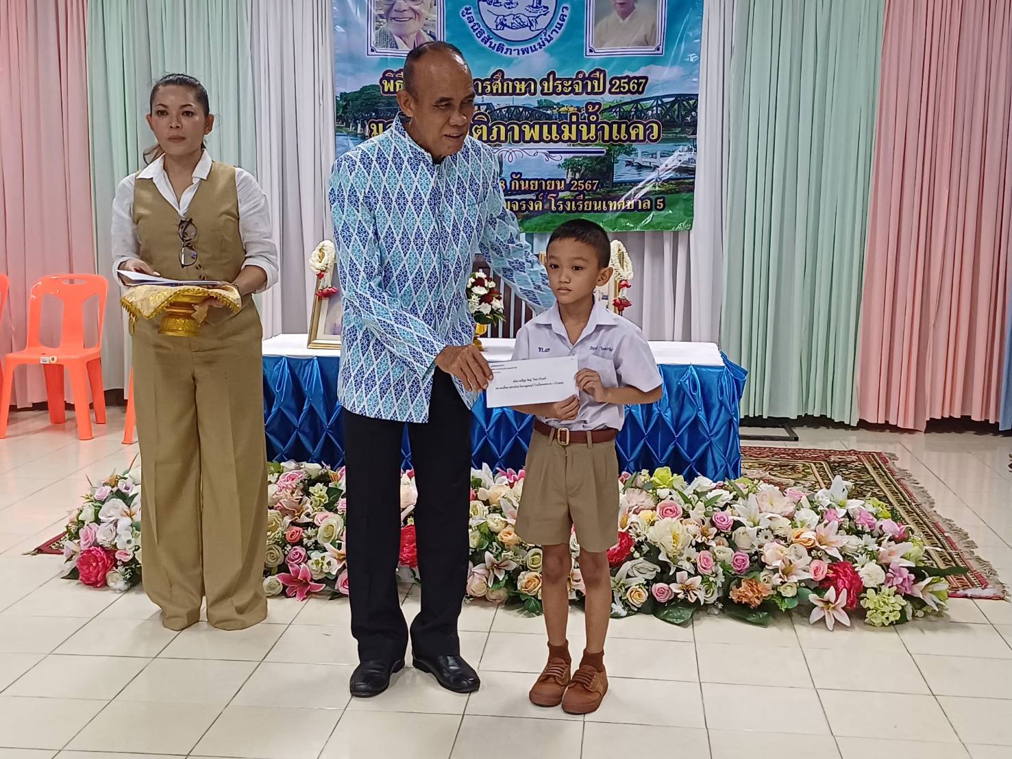 กาญจนบุรี-ผู้สื่อข่าวรายงานว่าเมื่อเวลา 09.30 น.วันที่ 28 กันยายน 2567 ที่โรงเรียนเทศบาล 5 (กระดาษไทยอนุเคราะห์)กาญจนบุรี นางสาวสุวรรณา ศุภชาติไกรสร ประธานมูลนิธิสันติภาพแม่น้ำแคว พร้อมด้วยนายวินิจ โรจนวงศ์ ประธานมูลนิธิเพื่อสวัสดิการสื่อมวลชนจังหวัดกาญจนบุรี พลเอกวิทยา จินตนานุรัตน์ รองประธานมูลนิธิสันติภาพแม่น้ำแคว พลตรีศรชัย มนตริวัตร อดีต รมช.มหาดไทย และอดีต ส.ส.กาญจนบุรี นายมิจิดา โยชิฮิโร กรรมการมูลนิธิสันติภาพแม่น้ำแคว นายวสันต์ ภูษิตกาญจนา นายกเทศมนตรีเมืองกาญจนบุรี นายสันติ พันธ์พุฒ ผู้อำนวยการโรงเรียนเทศบาล 5 (กระดาษไทยอนุเคราะห์) และแขกผู้มีเกียรติได้ร่วมทำพิธีมอบทุนการศึกษาให้แก่นักเรียน นักศึกษา ที่เรียนดีแต่ประสบปัญหาเกี่ยวกับเรื่องทุนทรัพย์ของมูลนิธิสันติภาพแม่น้ำแควประจำปี 2567 จำนวน 80 ทุน