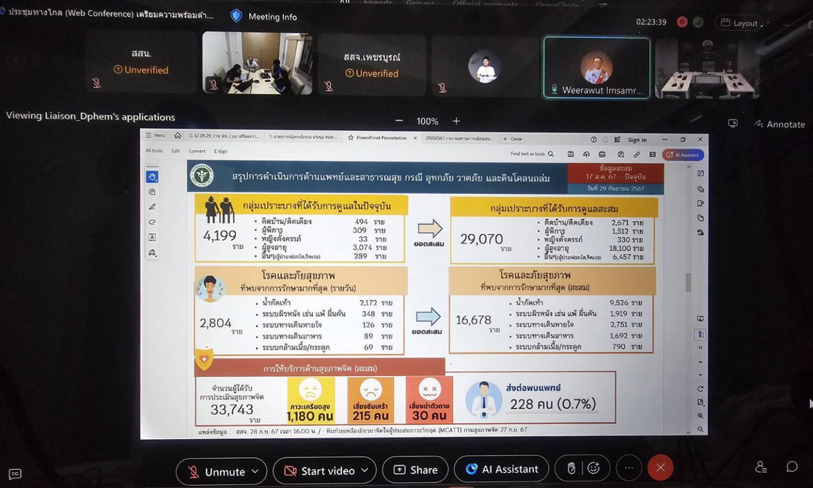 วันนี้ (29 กันยายน 2567) ที่กระทรวงสาธารณสุข จ.นนทบุรี นพ.วีรวุฒิ อิ่มสำราญ ผู้ตรวจราชการกระทรวงสาธารณสุข เขตสุขภาพที่ 8 กล่าวภายหลังเป็นประธานการประชุมทางไกลเตรียมความพร้อมด้านการแพทย์และสาธารณสุข กรณี สถานการณ์อุทกภัย วาตภัย และดินโคลนถล่ม ครั้งที่ 13/2567 ว่า ยังมี 18 จังหวัดที่ได้รับผลกระทบ มีผู้เสียชีวิตเพิ่มอีก 1 ราย ที่ จ.ลำปาง จากไฟฟ้าดูด รวมเสียชีวิตสะสม 53 ราย สูญหาย 1 ราย บาดเจ็บเพิ่ม 111 ราย สะสม 1,833 ราย เปิดศูนย์พักพิงเพิ่มเป็น 137 แห่ง มีผู้รับบริการ 649 ราย ดูแลช่วยเหลือกลุ่มเปราะบางแล้ว 29,070 ราย เพิ่มขึ้น 4,199 ราย ส่วนใหญ่เป็นผู้สูงอายุถึง 3,000 กว่าราย ยังคงพบน้ำกัดเท้าเข้ารับการรักษามากที่สุด ส่วนด้านสุขภาพจิต รับการประเมินสะสม 33,743 ราย พบเครียดสูง 1,180 ราย เสี่ยงซึมเศร้า 215 ราย และเสี่ยงฆ่าตัวตาย 30 ราย โดยทุกรายที่มีความเสี่ยงได้เข้าสู่กระบวนการรักษาทางการแพทย์แล้ว