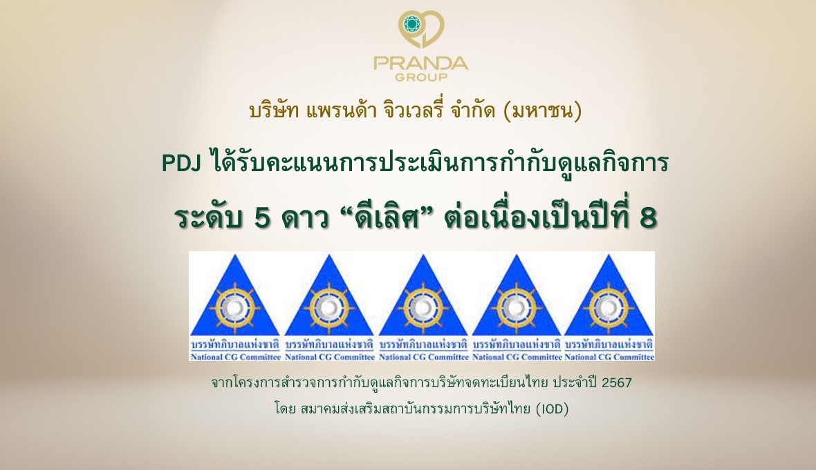 กรุงเทพฯ-บริษัท แพรนด้า จิวเวลรี่ จำกัด (มหาชน) หรือ “PDJ” ได้รับผลการประเมินการกำกับดูแลกิจการของบริษัทจดทะเบียน ประจำปี 2567 ระดับ “ดีเลิศ” (Excellent CG Scoring) ต่อเนื่องเป็นปีที่ 8 จากสมาคมส่งเสริมสถาบันกรรมการบริษัทไทย (IOD) โดยการสนับสนุนจากตลาดหลักทรัพย์แห่งประเทศไทย