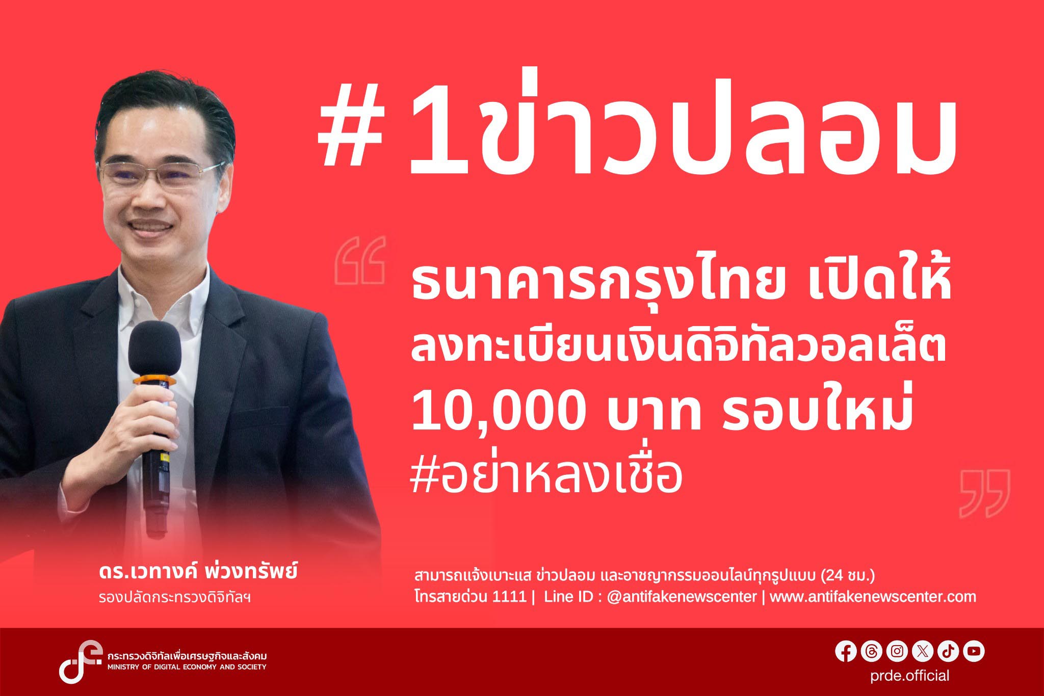 กรุงเทพฯ-ดีอี เตือน ข่าวปลอม “ธนาคารกรุงไทย เปิดลงทะเบียนเงินดิจิทัลวอลเล็ต 10,000 บาท รอบใหม่” ขออย่าเชื่อ-แชร์ หวั่นสูญเงิน-ข้อมูลส่วนบุคคล