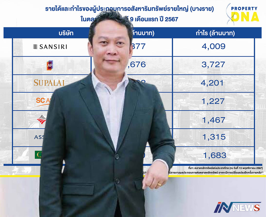 นายสุรเชษฐ กองชีพ กรรมการผู้จัดการ พร็อพเพอร์ตี้ ดีเอ็นเอ (Property DNA) กล่าวว่า ผู้ประกอบการรายใหญ่ในตลาดหลักทรัพย์ที่มีรายได้รวมมากที่สุดในช่วง 9 เดือน ที่ผ่านมาของปี 2567 คือ กลุ่มแสนสิริ มีรายได้เป็นอันดับ 1 จำนวน 28,877 ล้านบาท โดยรายได้หลักมาจากการขายบ้านในโครงการจัดสรร โดยเฉพาะกลุ่มบ้านลักชัวรี่ที่มีราคาแพง ส่วนคอนโดมิเนียมมีรายได้จากการโอนกรรมสิทธิ์โครงการในต่างจังหวัดในสัดส่วนที่มากกว่ากรุงเทพฯ