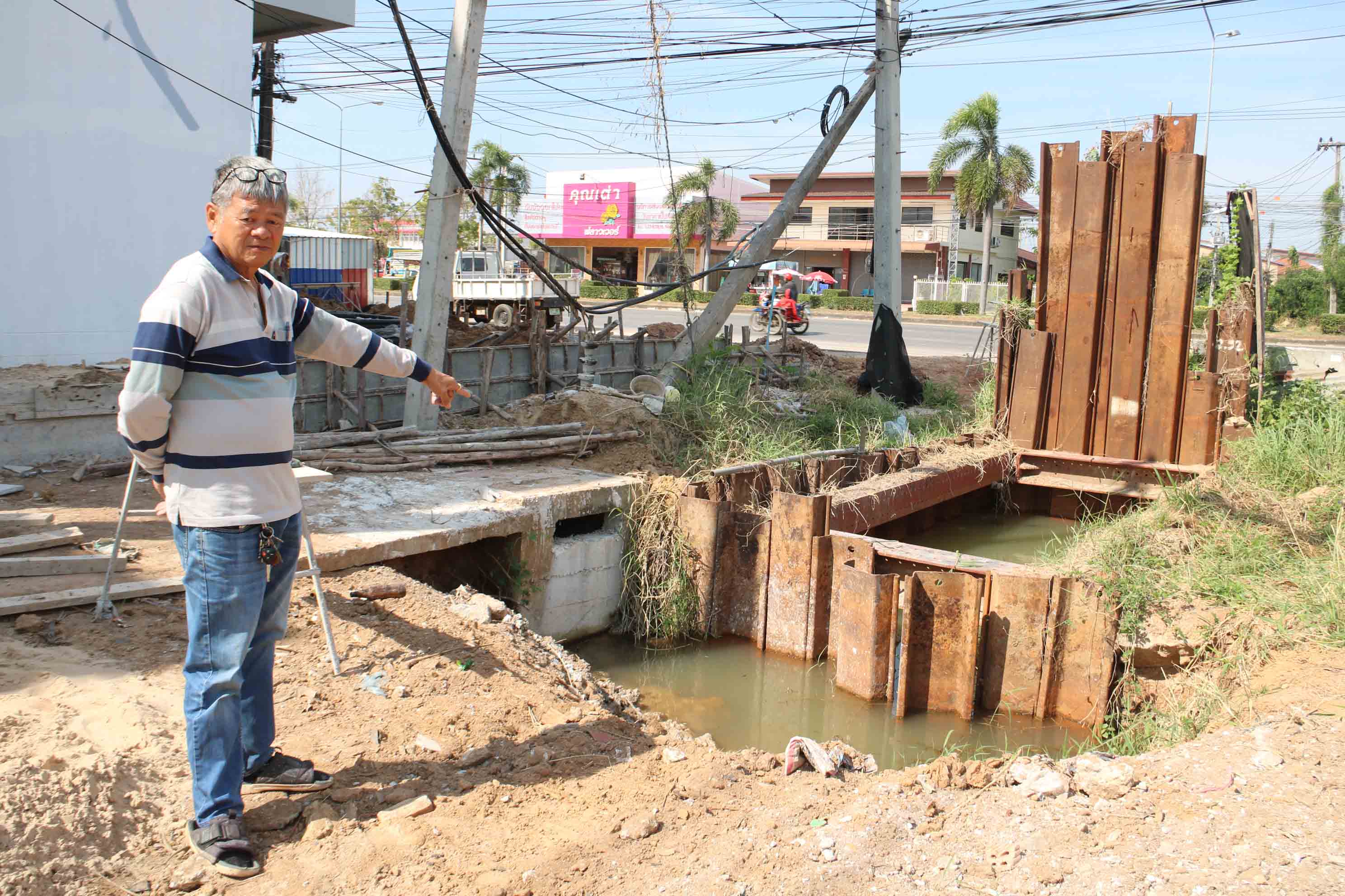 นายไชยนิกร วิมลศรีนราชัย อายุ 65 ปี ผู้ประกอบการถนนหัวคู-หนองเรือพัฒนา ทางไปศูนย์ราชการ จ.กาฬสินธุ์กล่าวว่า ถนนเส้นนี้ที่เชื่อมไปถึงศาลากลาง จ.กาฬสินธุ์ เดิมมีความสวยงามมาก 2 ฝั่งเต็มไปด้วยอาคาร ร้านค้า ร้านอาหาร ถือเป็นเส้นทางหลักอีกเส้นทางหนึ่ง ที่พี่น้องประชาชน ตลอดจนนักท่องเที่ยว ผู้คนจากต่างจังหวัด รวมถึงแขกบ้านแขกเมืองที่สัญจรไปมาได้ชื่นชม แต่พอมีโครงการขุดลอกริมถนนเพื่อวางระบบท่อ ของโครงการป้องกันปัญหาน้ำท่วมเมืองกาฬสินธุ์ งบ 148 ล้านบาทมาลงพื้นที่ ไม่ต่างกับมาทำลายความสวยงามของถนนเส้นนี้เสียหาย กลายเป็นถนนที่เสี่ยงอันตราย จากเศษซากวัสดุ เหล็กแหลม หลุมบ่อ และเกิดอุบัติเหตุบ่อย ชาวเมืองกาฬสินธุ์ ที่มีที่พักอาศัย และที่ประกอบการอยู่ใกล้บริเวณก่อสร้าง ต่างได้รับผลกระทบเดือดร้อนไม่ต่างกัน ซึ่งหากใครไม่ได้อยู่กับปัญหาเหล่านี้คงไม่เข้าใจว่า เดือดร้อน เป็นทุกข์ใจมากขนาดไหน อาคารร้านค้า หอพัก บ้านเช่า ที่เคยเป็นอาชีพ เกิดการค้าข้าย มีรายได้เลี้ยงครอบครัว ส่งเสียลูกเรียนหนังสือ ก็ต้องปิดตัวลงและปิดตายในที่สุด เพราะหน้าบ้าน หน้าร้านเป็นหลุมบ่อและกองวัสดุ สำหรับตนที่กำลังก่อสร้างอาคารพาณิชย์ ก็ได้รับผลกระทบ หวั่นอาคารทรุด ต้องเพิ่มทุนในการนำอิฐ หิน ปูนทราย มาสร้างแนวกันทรุด และอุดบริเวณที่เป็นโพรงดิน ที่เกิดจากน้ำกัดเซาะในฤดูน้ำหลาก เนื่องจากอยู่ส่วนปลายทางน้ำที่ไม่มีท่อระบายน้ำ ซึ่งทุกวันนี้น้ำก็ยังเอ่อขังอยู่ จึงอยากเรียกร้องไปถึงผู้มีอำนาจในบ้านเมือง เร่งจัดการหาผู้รับหมารายใหม่มาทำงานต่อให้แล้วเสร็จด้วย