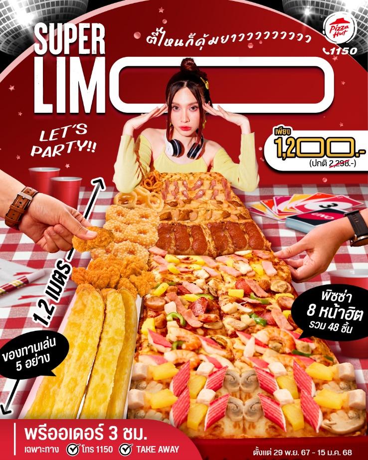 กรุงเทพฯ ประเทศไทย, 29 พฤศจิกายน 2567 – พิซซ่า ฮัท 1150 แบรนด์พิซซ่าระดับโลก ภายใต้การบริหารงานของบริษัท พีเอช แคปปิตอล จำกัด กลับมาสร้างสีสันให้เทศกาลแห่งความสุขกันอีกครั้งกับเมนู “Super Limo (ซูเปอร์ ลิโม่)” พิซซ่าที่ยาวกว่า คุ้มกว่า เยอะกว่า ของแท้จากอเมริกา จุใจกับพิซซ่า 48 ชิ้น 8 หน้าฮิตที่ใครๆ ก็ต้องหลงรัก และของทานเล่น 5 อย่าง เซ็ตเมนูอิ่มคุ้มนี้มาพร้อมขนาดกล่องสุดตื่นตายาวถึง 1.2 เมตร พร้อมแล้วที่จะมาทำให้ทุกปาร์ตี้มีชีวิตชีวาและเต็มไปด้วยเสียงหัวเราะ ไม่ว่าจะสั่งมารับประทานพร้อมแก๊งเพื่อน หรือครอบครัวก็ฟิน ในราคาเพียง 1,200 บาท (จากราคาปกติ 2,298 บาท) ตั้งแต่วันนี้ – 15 มกราคม 2568