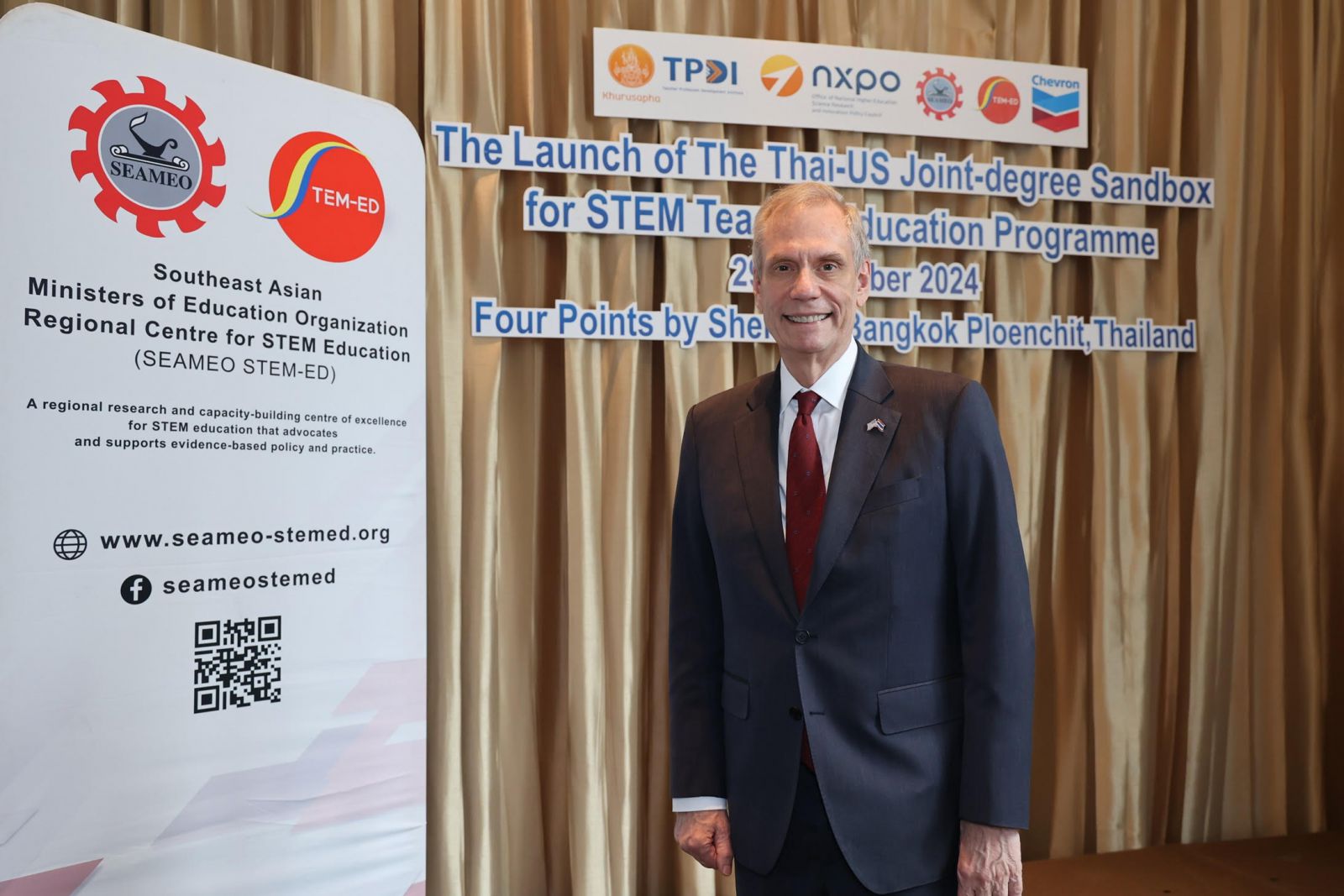กรุงเทพฯ-ประเทศไทยเปิดก้าวแรก โครงการนำร่อง หลักสูตรปริญญาร่วมไทย-สหรัฐอเมริกา ครุศาสตร์/ศึกษาศาสตร์ ด้านสะเต็มศึกษา (Thai-US Joint-degree Sandbox for STEM Teacher Education Program) พลิกโฉมการพัฒนาครูมืออาชีพก้าวนำการเปลี่ยนแปลงโลกปัจจุบัน ต่อยอดจากโครงการครุศึกษายุคใหม่SEA-TEP (Southeast Asian Teacher Education Program) ในระดับภูมิภาค ภายใต้ความร่วมมือระหว่างศูนย์ระดับภูมิภาคว่าด้วยสะเต็มศึกษาขององค์การรัฐมนตรีศึกษาแห่งเอเชียตะวันออกเฉียงใต้ (ศูนย์ SEAMEO STEM-ED) สำนักงานสภานโยบายการอุดมศึกษา วิทยาศาสตร์ วิจัย และนวัตกรรมแห่งชาติ (สอวช.) สำนักงานเลขาธิการคุรุสภา และพันธมิตรภาคการศึกษาอีกมากมาย โดยจากที่ภาครัฐตระหนักถึงความสำคัญของการพัฒนาครูไทยให้ก้าวไกลสู่มาตรฐานระดับโลก จึงให้การสนับสนุนโครงการฯ ผ่านกระทรวงศึกษาธิการ และกระทรวงการอุดมศึกษา วิทยาศาสตร์ วิจัยและนวัตกรรม ซึ่งไม่เพียงแต่สะท้อนก้าวสำคัญของการศึกษาไทย แต่ยังตอบโจทย์ความต้องการกำลังคนคุณภาพที่สอดรับกับยุคสมัย พร้อมตั้งเป้าเป็นโมเดลต้นแบบเพื่อเตรียมความพร้อมแก่นิสิตนักศึกษาครูและครูประจำการให้มีคุณภาพระดับสากลผ่านการผสานหลักสูตรของสถาบันเครือข่ายการศึกษาในประเทศไทยและสหรัฐอเมริกา โดยมีทั้งเอกอัครราชทูตสหรัฐอเมริกาประจำประเทศไทย นักการศึกษา ผู้กำหนดหลักสูตรและนโยบายจากหลากหลายประเทศในเครือข่ายเข้าร่วมงานที่นับเป็นก้าวสำคัญของการพัฒนาครูจากต้นน้ำจากระดับประเทศสู่ภูมิภาค