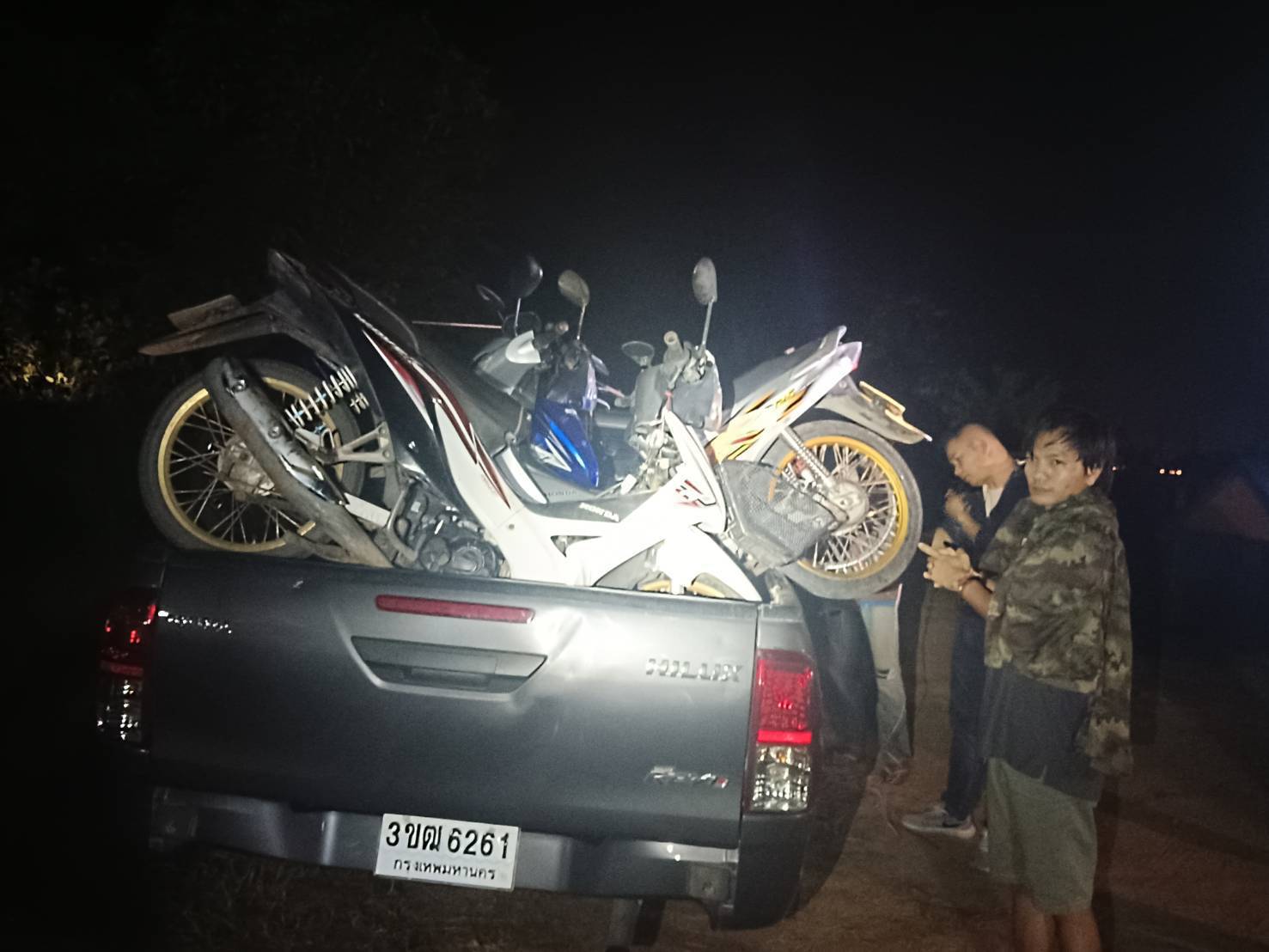 โดยจากการตรวจยึดพบ จยย.ของกลางจำนวน 10 คัน 1.รถ จยย.ยี่ห้อ ฮอนด้ารุ่น เวฟ 100 ไอ หมายเลขตัวรถ MLHJA142C5245221 สี ขาว-แดง ไม่ติดแผ่นป้ายทะเบียน, 2. รถ จยย.ยี่ห้อ ฮอนด้ารุ่น เวฟ 100 หมายเลขตัวรถ MLHJA1444C5010667 สี ขาว-แดง ไม่ติดแผ่นป้ายทะเบียน 3. รถ จยย.ยี่ห้อ ฮอนด้ารุ่น เวฟ 100 ไอ หมายเลขตัวรถ MLHJA1422k5910646 สี ดำ-เทา ไม่ติดแผ่นป้ายทะเบียน, 4. รถ จยย.ยี่ห้อ ฮอนด้ารุ่น เวฟ 100 ไอ หมายเลขตัวรถ MLHJA142xc5267413 สี น้ำเงิน-ดำ ไม่ติดแผ่นป้ายทะเบียน, 5. รถ จยย.ยี่ห้อ ฮอนด้ารุ่น เวฟ 100 ไอ หมายเลขตัวรถ MLHJA1446E5390050 สี ขาว-ดำ หมายเลขทะเบียน 2 กฐ 8237 กรุงเทพมหานคร, 6. รถ จยย.ยี่ห้อ ฮอนด้ารุ่น เวฟ 100 ไอ หมายเลขตัวรถ MLHJA1425K5897659 สี น้ำเงิน-ดำ ไม่ติดแผ่นป้ายทะเบียน, 7. รถ จยย.ยี่ห้อ ฮอนด้ารุ่น เวฟ 125 R สี เทา-ดำ หมายเลขทะเบียน กมล-922 เพชรบุรี, 8. รถ จยย. ยี่ห้อ ฮอนด้ารุ่น เวฟ 100 สี ดำ หมายเลขทะเบียน 1กถ – 2326 ร้อยเอ็ด, 9. รถ จยย.ยี่ห้อ ฮอนด้ารุ่น เวฟ Z หมายเลขตัวรถถูกขูดลบ ไม่ติดแผ่นป้ายทะเบียน และ 10. รถ จยย. ยี่ห้อ ยามาฮ่า รุ่น ฟีโน่ ไม่ติดแผ่นป้ายทะเบียน