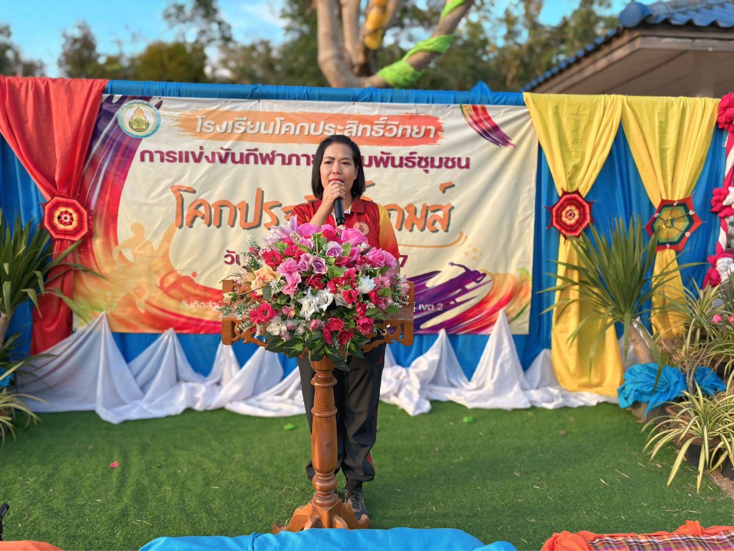 นางศิรารัตน์ นาถมทอง ผอ.ร.ร.โคกประสิทธิ์วิทยา กล่าวว่า ในการจัดกิจกรรมแข่งขันกีฬาภายในสัมพันธ์ชุมชน “โคกประสิทธิ์เกมส์” ประจำปีการศึกษา 2567 ครั้งนี้ เพื่อให้นักเรียน คณะครู ผู้ปกครอง ชุมชน มีสุขนิสัยในการดูแลสุขภาพ ด้วยการการออกกำลังกาย และสนใจการเล่นกีฬา เป็นการเชื่อมความสัมพันธ์อันดีระหว่างคณะครู ผู้ปกครอง และชุมชน ตลอดจนฝึกฝนการเป็นผู้นำ ผู้ตามที่ดี มีน้ำใจเป็นนักกีฬา รู้แพ้ รู้ชนะ รู้อภัย เสริมสร้างความสามัคคีในหมู่คณะ และส่งเสริมให้นักเรียนเยาวชนและประชาชน ใช้เวลาว่างออกกำลังกายห่างไกลยาเสพติด
