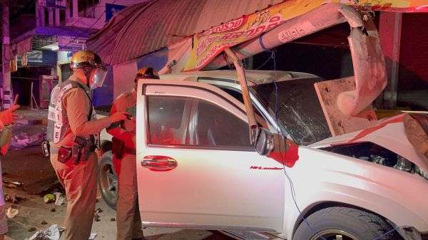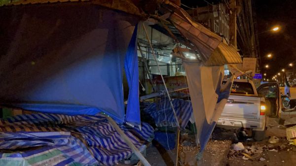 นครราชสีมา-หนุ่มเมาหนักควบกระบะพุ่งชนแผงขายผลไม้และเสาไฟส่องสว่างพังยับเจ้าของแผงโอดเพิ่งทำร้านใหม่เสียหายนับแสนบาท