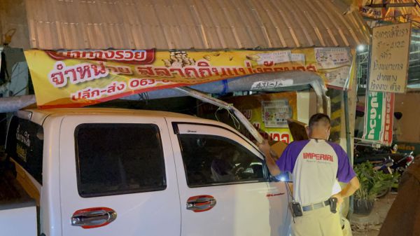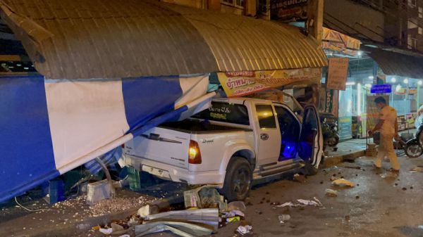 หนุ่มเมาได้ที่ควบกระบะพุ่งชนแผงผลไม้ เสียหายนับแสน