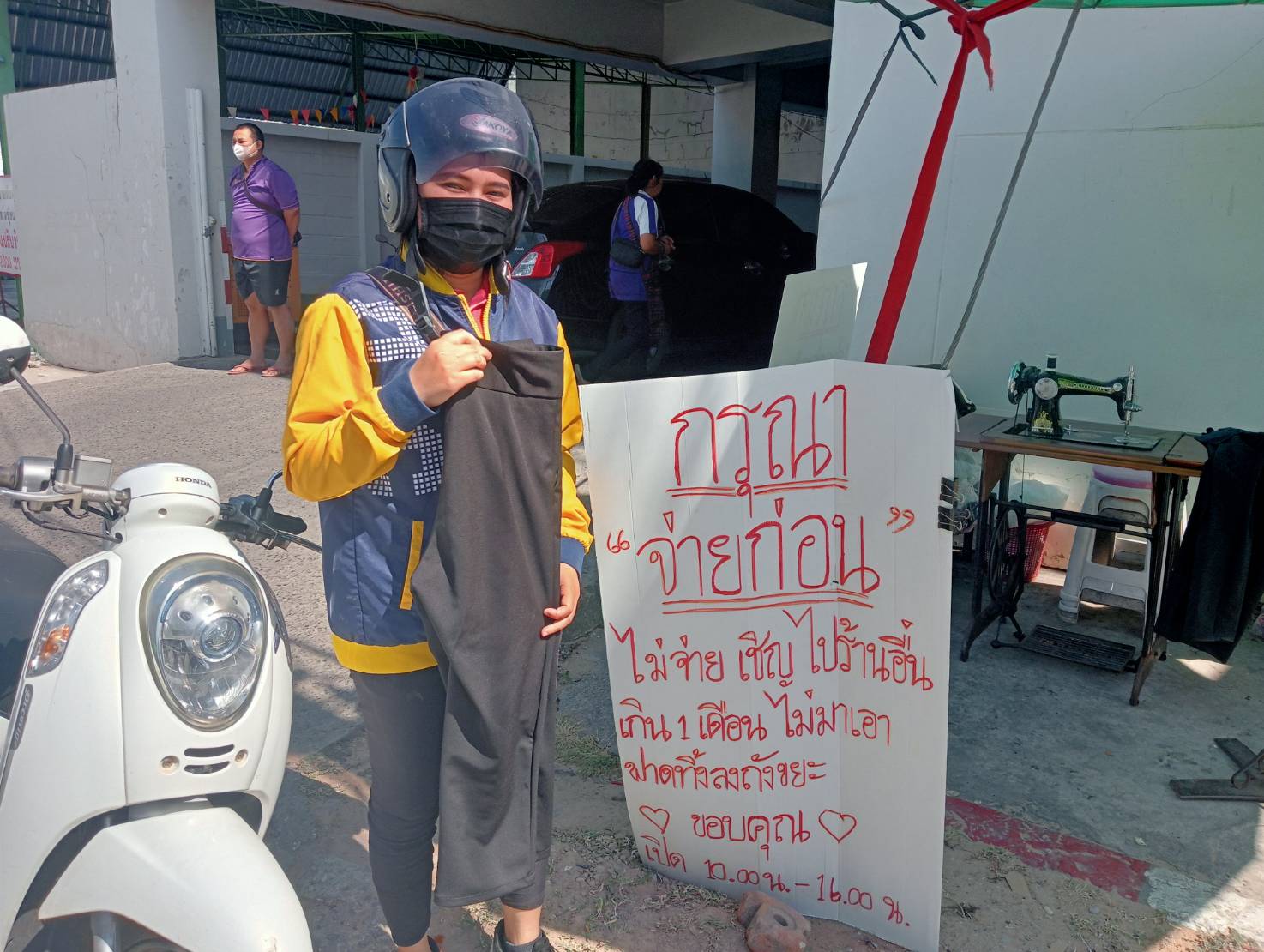 “สำหรับที่มาที่ไปของการขึ้นป้ายดังกล่าว เพราะเคยมีบทเรียนจากสมัยคุณพ่อคุณแม่รับบริการดังกล่าว ลูกค้าที่นำเสื้อผ้ามาให้ซ่อม พอคุณพ่อคุณแม่ทำการซ่อมเสร็จแล้วกลับไม่มาเอา บางคนทิ้งระยะห่างนานหลายเดือนหรือเป็นปีจึงมารับคืน หรือไม่มารับคืนก็เป็นจำนวนมาก กลายเป็นภาระและความลำบาก ทั้งลงทุนเปลี่ยนซิป เปลี่ยนตะขอให้ ปะชุนให้ ยังไม่พอ ยังต้องคอยขนย้ายกลับไปกลับมาบ้านพัก เพื่อรักษาเสื้อผ้าของลูกค้าไว้ ป้องกันการสูญหาย เพราะจุดที่เราให้บริการอยู่บนฟุตบาธ เหมือนเป็นจุดบริการชั่วคราว ไม่ได้ทำเป็นห้องปิดมิดชิด จึงกลายเป็นภาระ เป็นความรับผิดชอบที่หนักเกินไป และในที่สุดเสื้อผ้าที่ลูกค้าไม่กลับมาเอา หลายเดือน หรือเป็นปีเหล่านั้น ก็จำเป็นต้องตัดสินใจนำไปบริจาคเสียเลย” นางสาวอ้อกล่าว