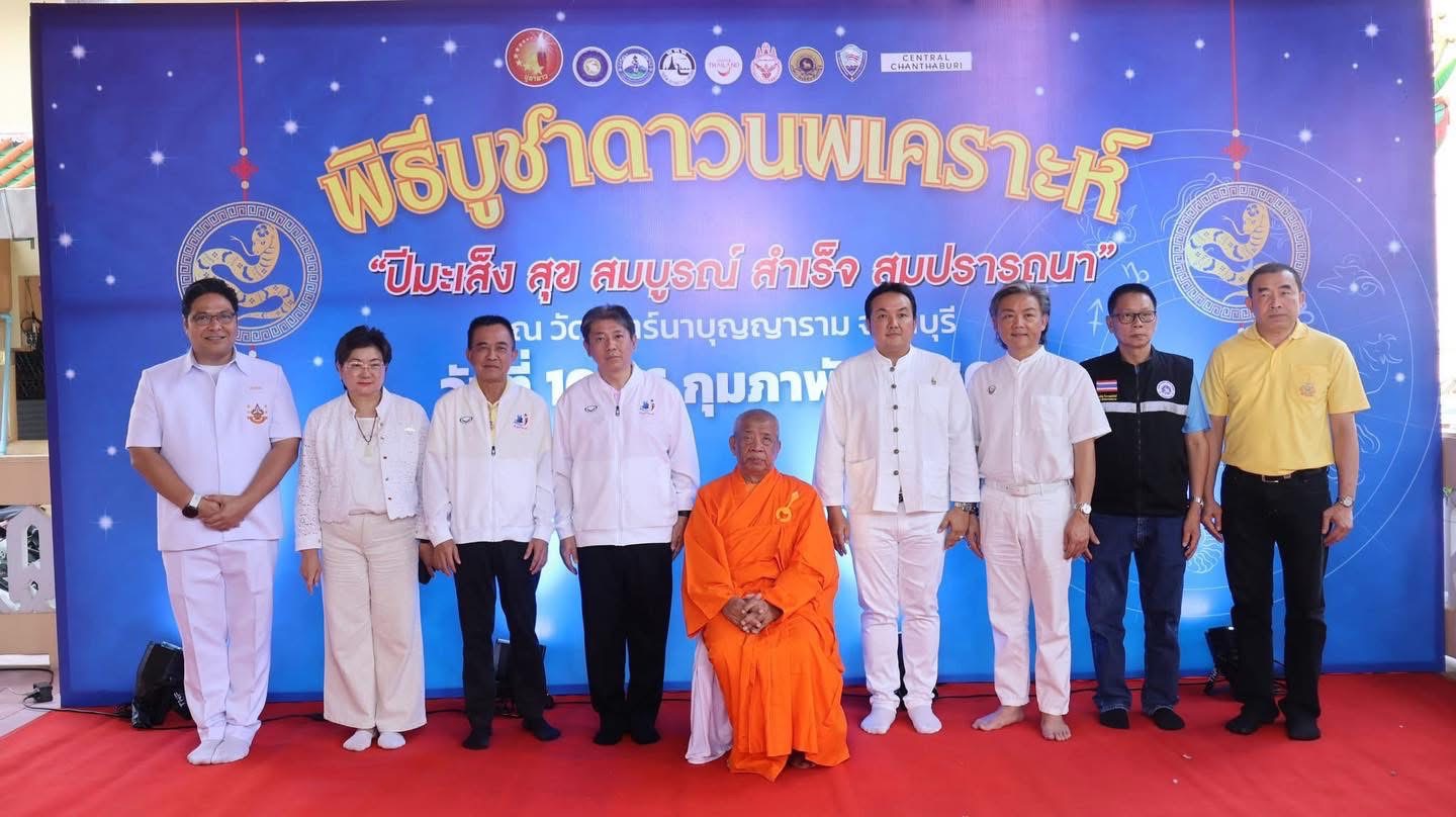 จันทบุรี-วันที่ 24 ม.ค.68 ที่วัดเขตร์นาบุญญาราม อ.เมือง จ.จันทบุรี องค์สุตบท บวร เจ้าอาวาสวัดเขตร์นาบุญญารามจังหวัดจันทบุรี พร้อมด้วยนายมนต์สิทธิ์ ไพศาลธนวัฒน์ ผู้ว่าราชการจังหวัดจันทบุรี นายกิจฐพร โชติสุวรรณ์ นายกเทศมนตรีเมืองจันทบุรี นายคมจักร ถาวรวิริยะนันท์ นายกเทศมนตรีเมืองจันทนิมิต นายอุกฤษฏ์ วงษ์ทองสาลี ประธานหอการค้าจังหวัดจันทบุรี นางสาวพรหมเพชร เลิศรัตนปรีชา รองผู้อำนวยการการท่องเที่ยวแห่งประเทศไทย สำนักงานจันทบุรี และนายกานน ธรรมเจริญ ประธานจัดงานฯ ร่วมแถลงข่าวการจัดงานบูชาดาวนพเคราะห์ วัดเขตร์นาบุญญาราม ประจำปี 2568 ซึ่งจะจัดขึ้น