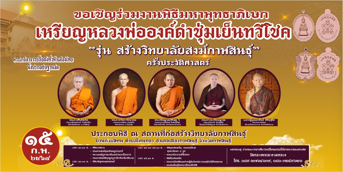 วันที่ 12 กุมภาพันธ์ 2568 คณะสงฆ์ และศิษยานุศิษย์ เชิญชวนพุทธศาสนิกชนและประชาชนร่วมบุญใหญ่ครั้งประวัติศาสตร์ พิธีมหาพุทธาภิเษกเหรียญหลวงพ่อองค์ดำชุ่มเย็นทวีโชค “รุ่นสร้างวิทยาลัยสงฆ์กาฬสินธุ์” ในวันที่ 15 กุมภาพันธ์ 2568 ที่บริเวณสถานที่ก่อสร้างวิทยาลัยสงฆ์กาฬสินธุ์ บ้านห้วยสีทน ต.โพนทอง อ.เมือง จ.กาฬสินธุ์