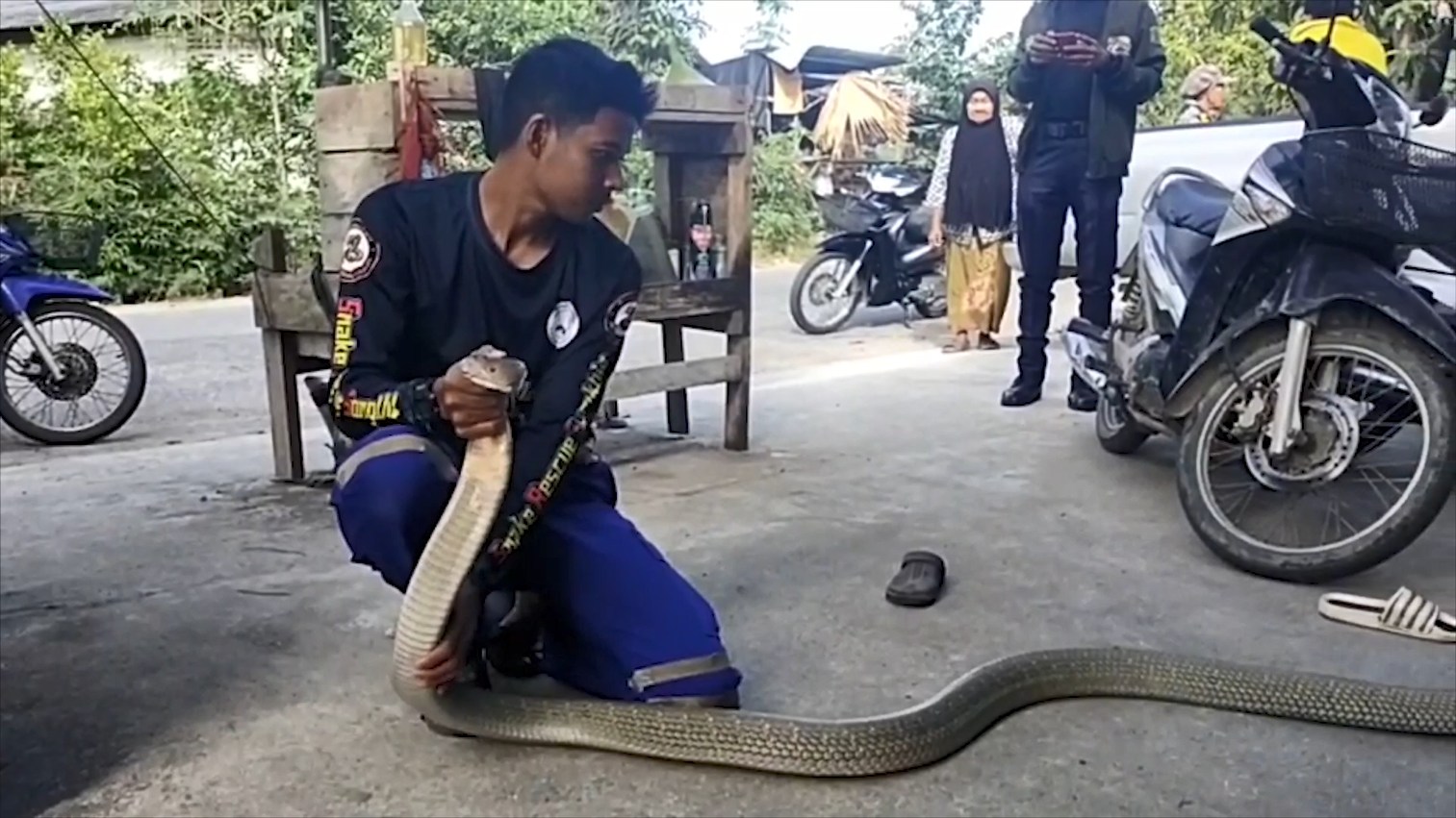 หลังจากที่นายทวีศักดิ์ บุญเศษ เจ้าหน้าที่ทีมอสรพิษวิทยาภาคใต้ ได้รับการประสาน จึงได้รีบนำอุปกรณ์ในการจับงู รุดเข้าตรวจสอบยังร้านขายน้ำชงทันที เมื่อเจ้าหน้าที่ไปถึงก็พบงูจงอางยักษ์ขดตัวอยู่ในถังล้างแก้วภายในร้าน จึงรีบเข้าทำการจับส่วนหัวของงูจงอาง ออกมาที่โล่ง แล้วจับงูมาวัดได้ความยาวถึง 3.70 เมตรเป็นจงอางเพศเมีย จึงนำใส่กระสอบเตรียมนำไปปล่อยคืนสู่ป่าธรรมชาติที่อยู่ห่างไกลบ้านเรือนผู้คนต่อไป