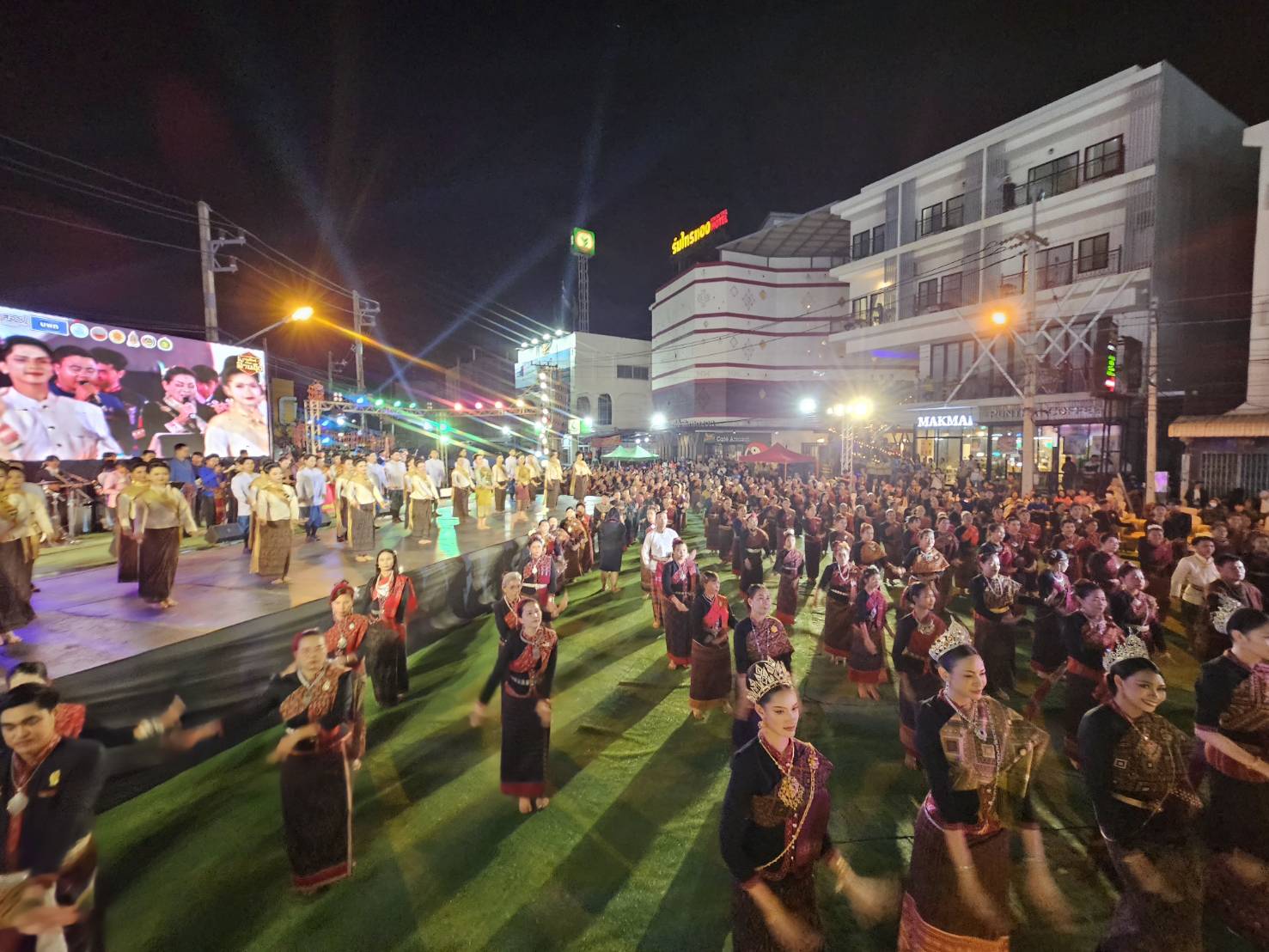 จากนั้นนางรำกว่า 1,000 คน จากทั้ง 18 อำเภอ ซึ่งมีทั้งข้าราชการ นักเรียน นักศึกษา ประชาชนชาว จ.กาฬสินธุ์ ซึ่งพร้อมใจกันสวมใส่ชุดผู้ไทอัตลักษณ์ของ จ.กาฬสินธุ์ โดยแต่ละชุดผ่านการถักทอด้วยด้วยภูมิปัญญาและตัดเย็บอย่างประณีตบรรจง ได้ร่วมกันรำบวงสรวงดวงวิญญาณพระยาชัยสุนทร (ท้าวโสมพะมิตร) เจ้าเมืองกาฬสินธุ์คนแรก โดยการฟ้อนมาลัยจำปา ฟ้อนภูไทกาฬสินธุ์ และฟ้อนเพลงเบิ่งกาฬสินธุ์ ด้วยท่วงท่าที่อ่อนช้อยสวยงาม ทั้งนี้เพื่อเป็นการบวงสรวงดวงวิญญาณพระยาชัยสุนทร และสิ่งศักดิ์สิทธิ์ เพื่อความเป็นสิริมงคล และขอให้การจัดงานมหกรรมโปงลาง แพรวา และงานกาชาด จ.กาฬสินธุ์ ประจำปี 2568 เป็นไปด้วยความเรียบร้อย