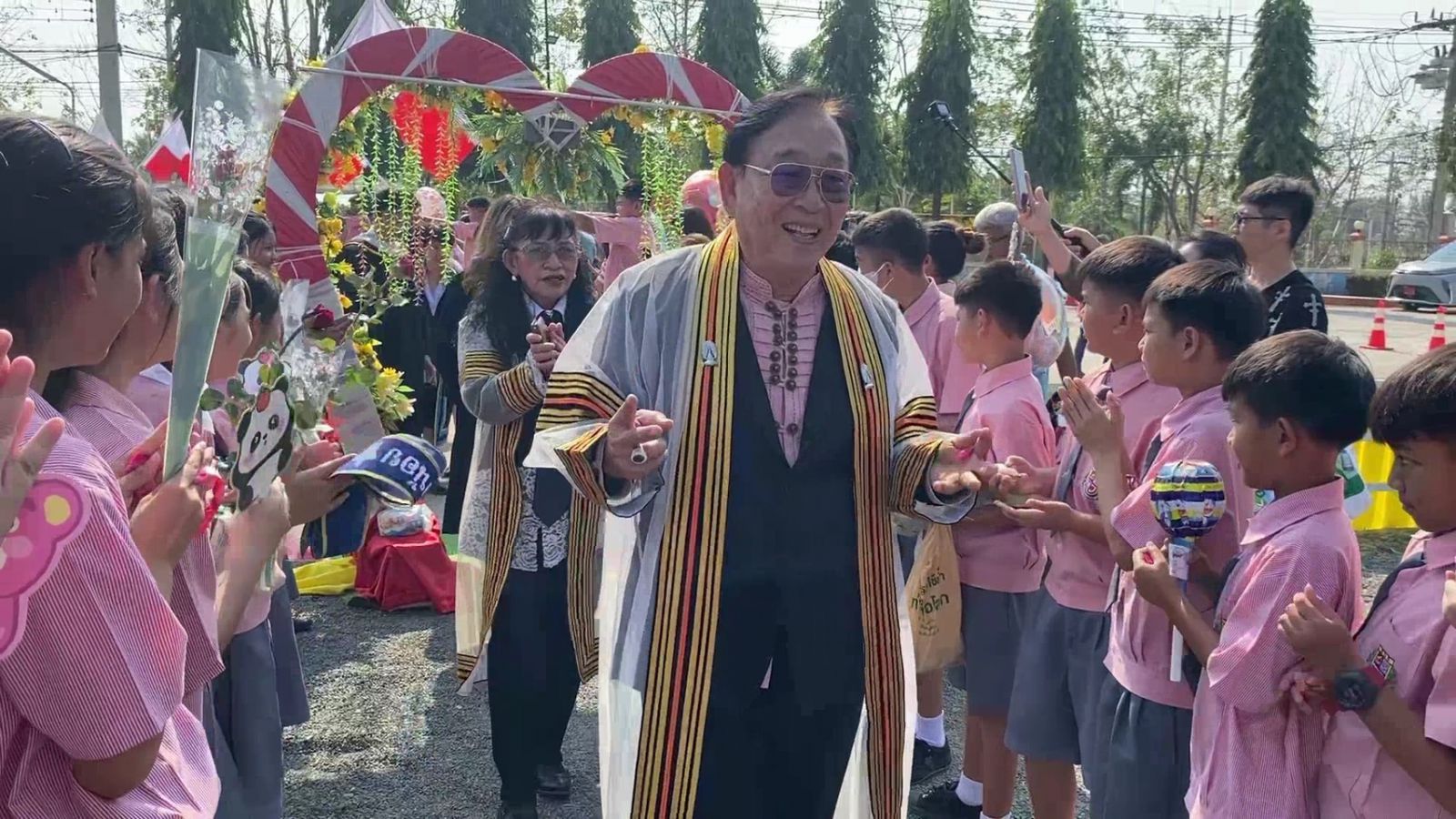 จากนั้น ดร.บัณฑิต ครุฑางคะ ผู้รับใบอนุญาตฯ พร้อมคณะผู้บริหาร ได้ร่วมนำนักเรียนที่สำเร็จการศึกษา เดินผ่านซุ้มแสดงความยินดี ตามธรรมเนียมปฏิบัติ โดยมีนักเรียนรุ่นพี่ ตั้งแต่ระดับชั้นประถมศึกษา จนถึงระดับชั้นมัธยมศึกษาปีที่ 3 คอยตั้งแถวรอรับยาวเหยียด พร้อมมอบดอกไม้ ของขวัญ เพื่อแสดงความยินดี