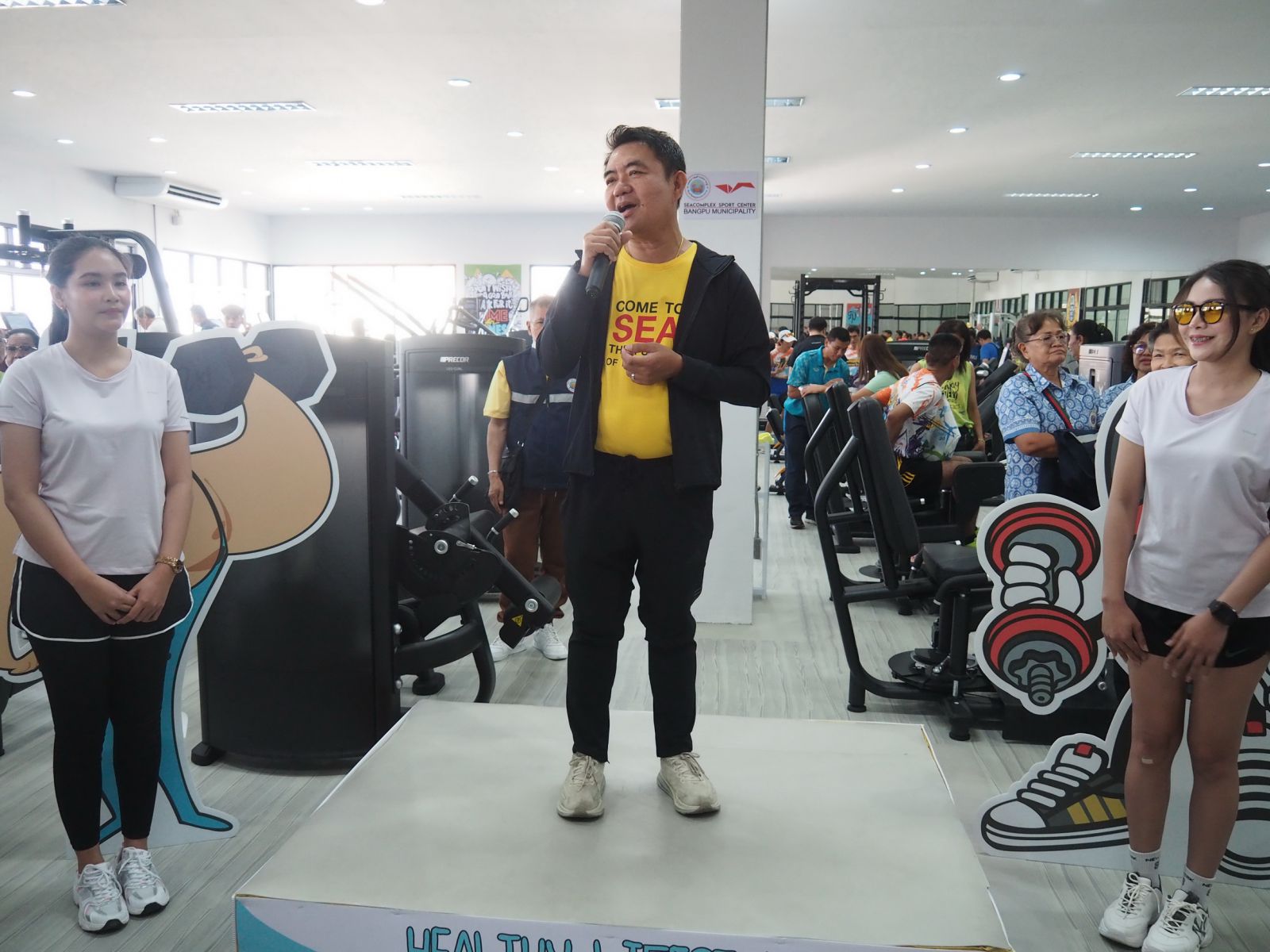 นายกเทศมนตรียังได้กล่าวอีกว่า วันนี้เราอยากให้ทุกคนที่มาเล่นกีฬาที่ศูนย์เป็นสมาชิกก่อน ถ้าเป็นสมาชิกที่อยู่ในเขตเทศบาลตำบลบางปู 4 ตำบล ไม่ต้องเสียค่าสมาชิก แต่ถ้าผู้ที่อยู่นอกเขตต้องเสียค่าสมาชิก200 บาท เนื่องจากเราต้องการทราบข้อมูล หากท่านมาออกกำลังกายกัน หากเกิดเป็นลม หรือไม่สบาย เราจะได้ทราบข้อมูลในการดูแลท่านต่อไป หากท่านได้เป็นสมาชิกแล้ว ท่านสามารถเล่นกีฬาได้ทุกอย่าง ยกเว้นที่ศูนย์ฟิตเนสเซนเตอร์ เพราะที่ศูนย์ฟิตเนสนั้นจะมีราคา รายวัน รายเดือน และรายปี แต่ราคานั้นขอยืนยันว่าถูกกว่าที่อื่นมากมาย โดยทางเทศบาลได้ใช้งบประมาณในการสร้างศูนย์ฟิตเนสจำนวน 30 ล้านบาท
