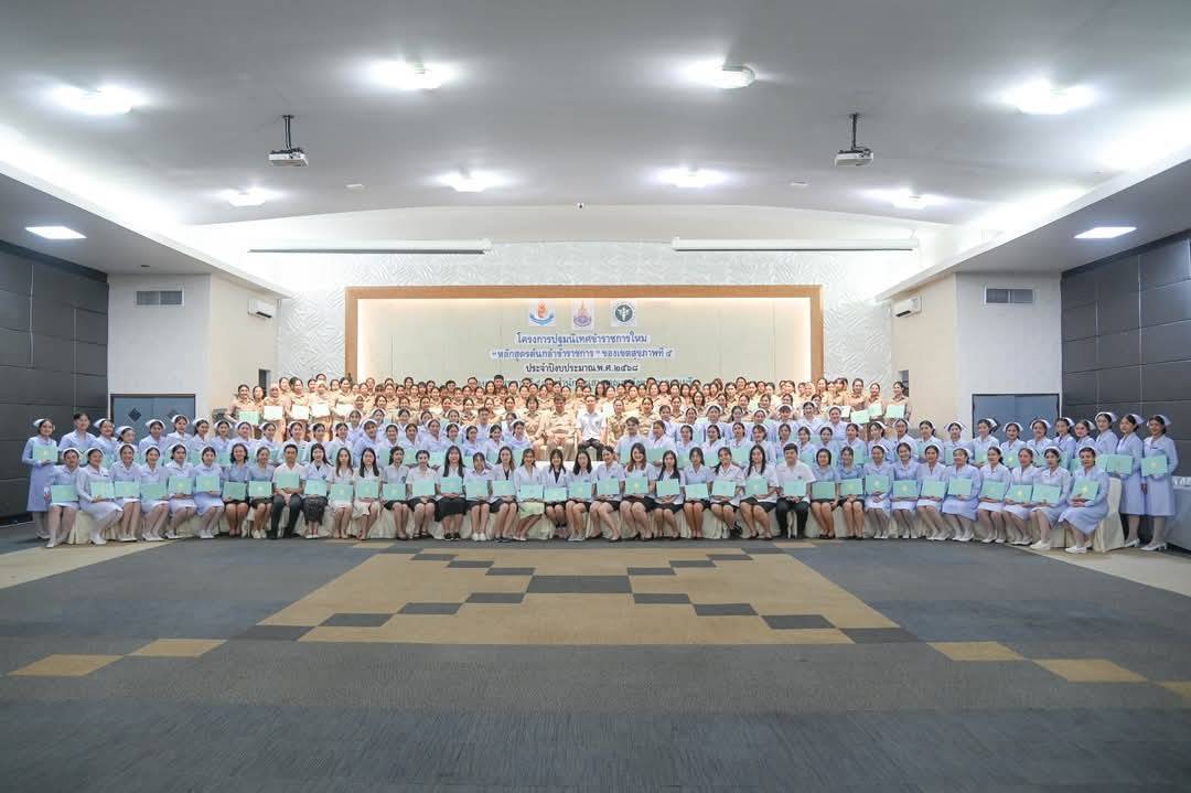 ผู้สื่อข่าวรายงานว่า เมื่อเวลา 13.00 น.ของวันที่ 28 มีนาคม 2568 ที่ผ่านมา ที่โรงแรมราชศุภมิตร ตำบลท่ามะขาม อำเภอเมืองกาญจนบุรี จังหวัดกาญจนบุรี นพ.ธีรพจน์ ฟักน้อย นายแพทย์สาธารณสุขจังหวัดกาญจนบุรี เป็นประธานมอบใบประกาศนียบัตรแก่ผู้สำเร็จการอบรมโครงการปฐมนิเทศข้าราชการใหม่ “หลักสูตรต้นกล้าข้าราชการ” ของเขตขสุขภาพที่ 5 ประจำปีงบประมาณ 2568 พร้อมทั้งให้โอวาทแก่ผู้สำเร็จการอบรมฯ เพื่อเป็นแนวทางในการปฏิบัติงานและการดำเนินชีวิต โดยวิทยาลัยพยาบาลบรมราชชนนี จักรีรัช ร่วมกับเขตสุขภาพที่ 5 ดำเนินการจัดโครงการปฐมนิเทศข้าราชการใหม่ “หลักสูตรต้นกล้าข้าราชการ” ของเขตสุขภาพที่ 5 ประจำปีงบประมาณ 2568 โดยผ่านการรับรองหลักสูตรจากสำนักงานคณะกรรมการข้าราชการพลเรือน การอบรมครั้งนี้ มีผู้เข้าร่วมทั้งสิ้นจำนวน จำนวน 200 คน