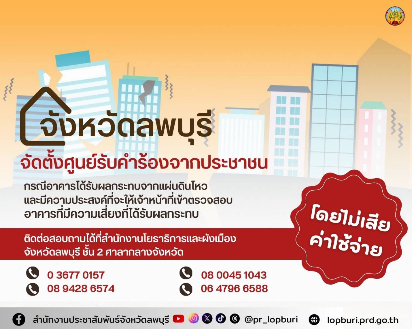 นายอำพล อังคภากรณ์กุล ผู้ว่าราชการจังหวัดลพบุรี เปืดเผยว่า จังหวัดลพบุรี โดยสำนักกรมโยธาธิการและผังเมืองจังหวัดลพบุรี ได้เปิดศูนย์รับคำร้องจากประชาชนกรณีที่อาคารได้รับผลกระทบจากเหตุแผ่นดินไหว และเข้าไปตรวจสอบอาคารทุกแห่งที่มีความเสี่ยง ที่ได้รับผลกระทบจากเหตุแผ่นดินไหว โดยไม่คิดค่าใช้จ่าย หากพบว่ามีปัญหาที่ต้องปรับปรุง แก้ไข ให้แจ้ง ผู้ประกอบการอาคารดำเนินการแก้ไข ปรับปรุงทันที เพื่อความปลอดภัยของประชาชน หากพบว่าอาคาร มีความไม่ปลอดภัย และไม่ได้ดำเนินการแก้ไข ปรับปรุง ให้ดำเนินการตามกฎหมายอย่างเคร่งครัด