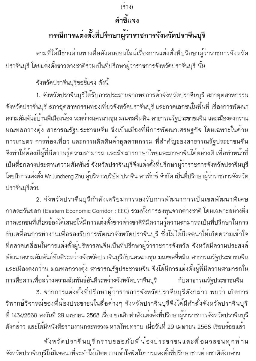 3. จากการแต่งตั้งที่ปรึกษาผู้ว่าราชการจังหวัดปราจีนบุรีดังกล่าว พบว่า เกิดการ วิพากษ์วิจารณ์ของพี่น้องประชาชนในสื่อต่างๆ จังหวัดปราจีนบุรีจึงได้มีคำสั่งจังหวัดปราจีนบุรี ที่ 1434/2568 ลงวันที่ 29 เมษายน 2568 เรื่อง ยกเลิกคำสั่งแต่งตั้งที่ปรึกษาผู้ว่าราชการจังหวัดปราจีนบุรี ดังกลาว และได้มีหนังสือรายงานกระทรวงมหาดไทยทราบ เมื่อวันที่ 29 เมษายน 2568 เรียบร้อยแล้ว