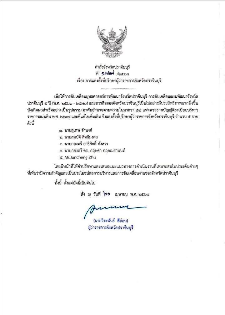 เมื่อเวลา 15.03 น.วันนี้30 เม.ย.68 ผู้สื่อข่าวรายงานความคืบหน้าจาก จ.ปราจีนบุรี กรณีนายวีระพันธ์ ดีอ่อน ผวจ.ปราจีนบุรีมีคำสั่งแต่งตั้งที่ปรึกษาผู้ว่าราชการจังหวัดรวมจำนวน5คนตามแผนยุทธศาสตร์พัฒนาจังหวัด5ปี โดยลำดับที่1-4เป็นคนไทยแต่ลำดับที่5 เป็นชาวจีน ทั้งนี้คำสั่งดังกล่าวเป็นการนำเสรอโดยหอการค้าจังหวัดปราจีนบุรี ,สมาคมการท่องเที่ยวจังหวัดปราจีนบุรีและสภาอุตสาหกรรมจังหวัดปราจีนบุรี เพื่อส่งเสริมการค้า การท่องเที่ยว การศึกษาเป็นบ้านพี่เมืองน้องระหว่างจังหวัดปราจีนบุรีกับจังหวัดของจีน แต่ภายหลังประกาศคำสั่งแต่งตั้งออกมาเพจและสื่อมวลชนนำเสนอได้รับการโจมตีจนทางจังหวัดได้ยกเลืกการแต่งตั้งที่ปรึกษาชาวจีนพร้อมแถลงสื่อมวลชนตามที่เสนอรายละเอียดไปแล้วก่อนนั้น