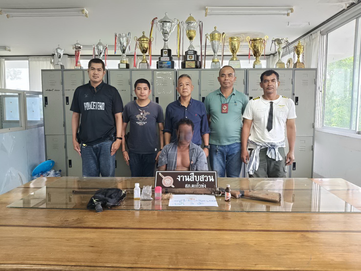 พังงา-เมื่อวันที่ 1 พฤษภาคม 2568 ภายใต้การอำนวยการและสั่งการของ พ.ต.อ.ประกอบ บุญขวัญ ผกก.สภ.ตะกั่วทุ่ง นำโดย พ.ต.ท.ภครพล ศรีสุข รอง ผกก.สส.สภ.ตะกั่วทุ่ง พร้อมด้วย ร.ต.ท.สมยศ ศรีทนนุกุล รอง สว.สส.สภ.ตะกั่วทุ่ง จ.ส.ต.จิรายุ ติธาดา ส.ต.ท.สรศักดิ์ ไทยสยาม เจ้าหน้าที่ฝ่ายปกครอง นายเกรียงไกร ทองสม ผู้ใหญ่บ้านบางหมัก หมู่ที่ 7 ตำบลกระโสม อำเภอตะกั่วทุ่ง จังหวัดพังงา บุกเข้าจับกุมตัวนายบุญฤทธิ์ (สงวนนามสกุล) ชาวบ้านหมู่ที่ 4 ตำบลกระโสม อำเภอตะกั่วทั่วทุ่ง จังหวัดพังงา ที่บ้านเช่าหลังหนึ่ง พร้อมด้วยของกลางมี ดังนี้ ยาบ้า ประทับตัวอักษร WY ชนิดสีส้ม จำนวน 3 เม็ด บรรจุอยู่ในถุงพลาสติกใส ชนิด กด - ปิด ดึงเปิด พร้อมด้วยอาวุธปืนยาวไทยประดิษฐ์ ไม่มีหมายเลขทะเบียน ความยาวลำกล้อง ขนาด 110ชม. จำนวน 1 กระบอก ลูกตะกั่ว จำนวน 40 เม็ด ลูกแก๊ป จำนวน 30 นัด และดินประสิว น้ำหนักประมาณ 10 กรัม เจ้าหน้าที่ตำรวจผู้จับได้แจ้งข้อกล่าวหาให้ผู้ถูกจับทราบว่า มียาเสพติดให้โทษประเภท 1 (ยาบ้า) ไว้ในครอบครองโดยไม่ได้รับอนุญาต และเสพยาเสพติดให้โทษประเกท1 (เมทแอมเฟตามีน) โดยฝ่าฝืนต่อกฎหมาย และมีอาวุธปืนและเครื่องกระสุนปืนไว้ในครอบครองโดยไม่ได้รับอนุญาต นำส่งพนักสอบสวนสภ.ตะกั่วทุ่งดำเนินการต่อไป