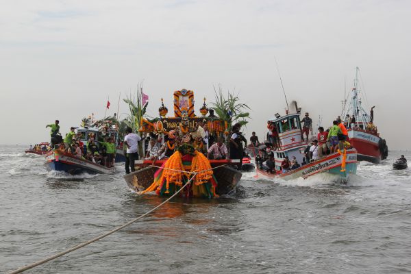 โดยมี เรือประมงของชาวบ้านจำนวนมากเข้าร่วมขบวนแห่ออกไปปากอ่าว จากนั้นได้แล่นเรือวนปากอ่าว 3 รอบ ก่อนจะแจกธงหลวงพ่อปาน ที่ชาวบ้านเคารพนับถือให้แก่ เรือประมงของชาวบ้าน และผู้ที่เดินทางไปร่วมงานที่บริเวณกลางทะเล จากนั้น ก็จะเคลื่อนขบวนกลับเข้าฝั่ง และอัญเชิญองค์หลวงพ่อปานขึ้นประดิษฐานบนรถบุษบกแห่ทางบก เพื่อให้ชาวบ้านได้นมัสการและขอพร