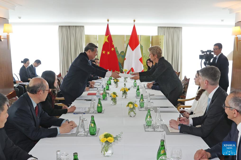 (แฟ้มภาพซินหัว : คาริน เคลเลอร์-ซัทเทอร์ ประธานสมาพันธรัฐสวิส และกี ปาร์เมแล็ง รองประธานคณะมนตรีกลางแห่งสมาพันธรัฐสวิส พบกับเหอลี่เฟิง รองนายกรัฐมนตรีจีน ณ นครเจนีวาของสวิตเซอร์แลนด์ วันที่ 9 พ.ค. 2025)