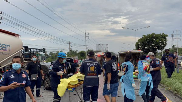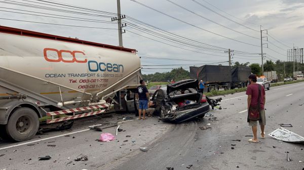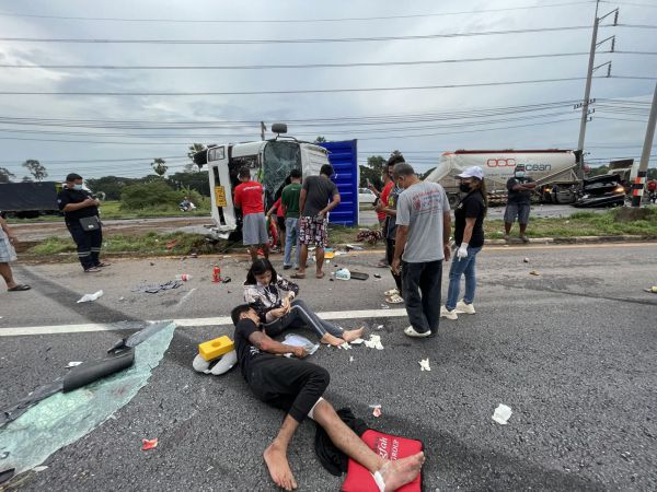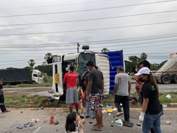 นครราชสีมา-ชนวินาศสันตะโรรถเบนซ์เสียหลักหมุนชนรถปูนยุบครึ่งคันก่อนรถสิบล้อตามหลังรถปูนเสยท้ายบาดเจ็บทันที 5 ราย