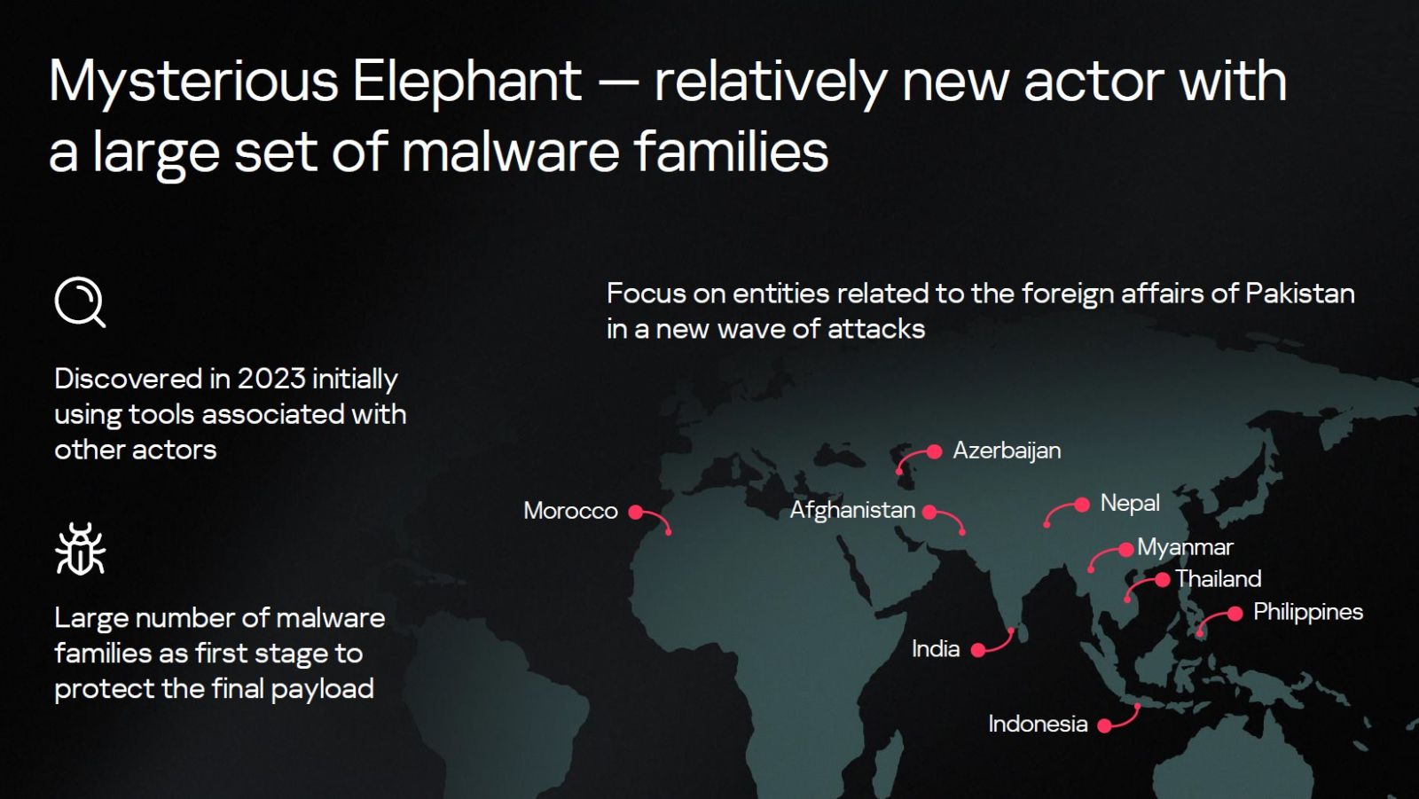 - Mysterious Elephant – แคสเปอร์สกี้ตรวจพบกลุ่มนี้ครั้งแรกในเดือนพฤษภาคม2023กลุ่มนี้ใช้แบ็กดอร์ตระกูลใหม่ที่สามารถสั่งการและจัดการไฟล์อย่างลับๆโดดเด่นและบางครั้งก็ซ้อนทับกับเทคนิคของAPT เช่นDropping Elephant, Origami Elephant, Bitter, Confucius และSide
