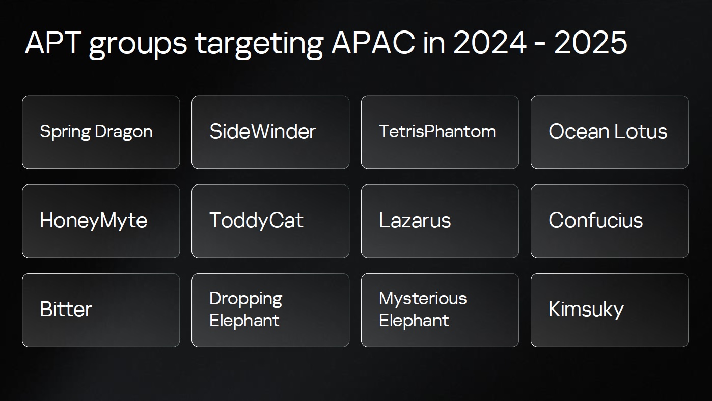 นักวิจัยของทีมKaspersky GreATดำเนินการตรวจสอบกลุ่มAPTและปฏิบัติการมากกว่า900รายการทั่วโลกโดยในภูมิภาคเอเชียแปซิฟิกมีกลุ่มหลักๆ ที่ดำเนินงานตั้งแต่ปี2024จนถึงปัจจุบันดังนี้