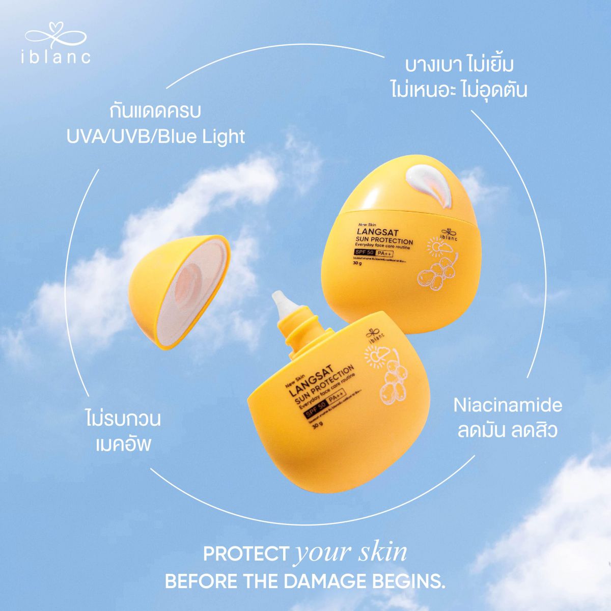 กันแดดยุคใหม่ ต้องไม่ใช่แค่ “กันแดดได้” แต่ต้อง บำรุงลึก ฟื้นฟูผิว และป้องกันผิวแก่ก่อนวัยได้ไปพร้อม ๆ กัน “iblanc Langsat Sun Protection SPF50 PA++” คือตัวอย่างของนวัตกรรมสกินแคร์ที่รวม “Active ระดับเวชสำอาง” กับ “สารกันแดดนำเข้า photostable” ที่ผสมผสานเข้ากันได้อย่างลงตัว เป็นกันแดดที่คิดค้นมาเพื่อทุกสภาพผิว โดยเฉพาะคนเป็นสิวผิวแพ้ง่ายมาก เป็นกันแดดที่ช่วยเสริมเกราะป้องกันผิวให้แข็งแรงขึ้น ไม่แห้งลอก ช่วยให้ผิวทนแดดได้ดี และยังเหมาะกับผู้ที่ใช้ยาแต้มสิวหรือกรดวิตามินเอได้อีกด้วย