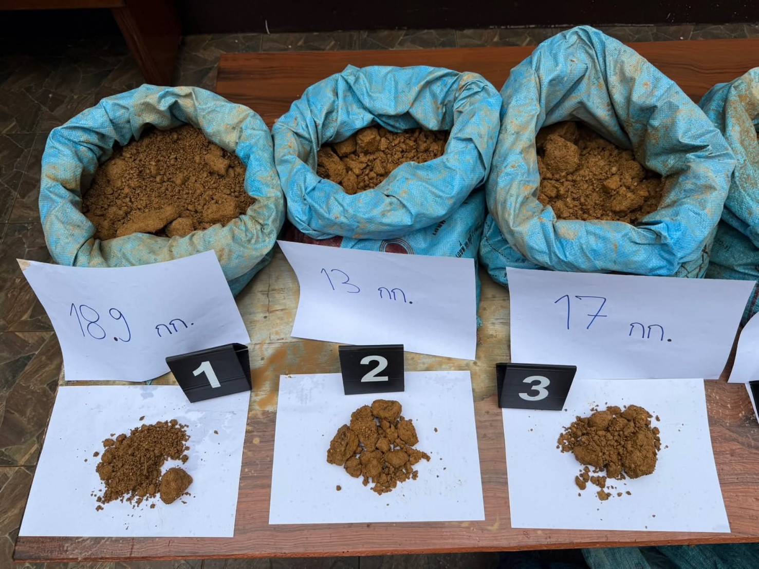 จากการตรวจสอบของกลางพบกระสอบปุ๋ยบรรจุดินน้ำหนักรวมกว่า 80 กิโลกรัม จำนวน 5 ถุง, เรียงร่อนแร่ 1 อัน, เปล 1 ผืน และเป้สะพายหลัง 5 ใบ เจ้าหน้าที่จึงเก็บรวบรวมส่งพนักงานสอบสวน สภ.ปิล๊อก เพื่อติดตามผู้กระทำผิดมาดำเนินคดีตามกฎหมาย