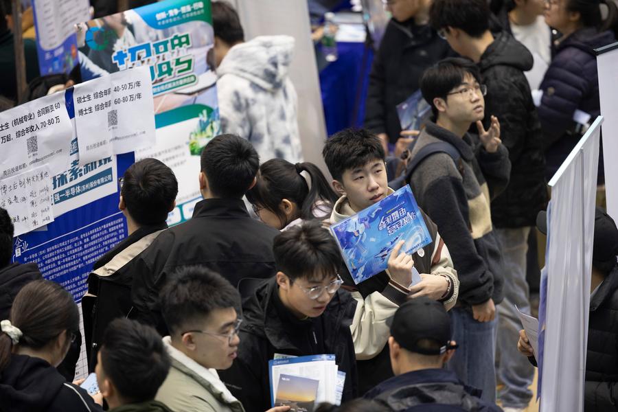 (แฟ้มภาพซินหัว: นักศึกษาเข้าร่วมมหกรรมจัดหางานที่สถาบันเทคโนโลยีฮาร์บิน เมืองฮาร์บิน มณฑลเฮยหลงเจียง ทางตะวันออกเฉียงเหนือของจีน วันที่ 26 มี.ค. 2025)