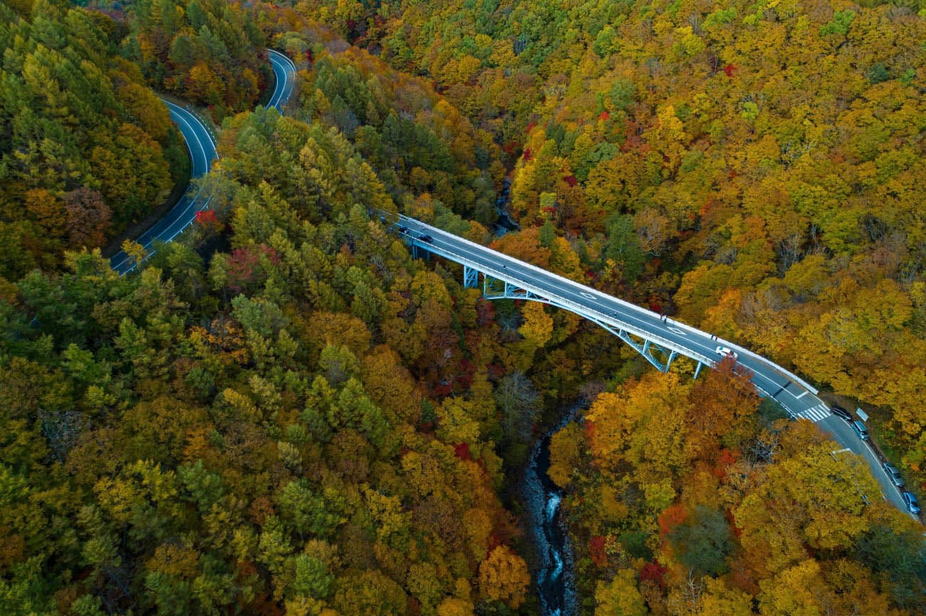 สำหรับใครที่ชื่นชอบการเช่ารถยนต์เที่ยวญี่ปุ่น เส้นทางนี้คือเส้นทางสำหรับขับรถชมใบไม้เปลี่ยนสีโดยเฉพาะ ถนนสายเลคไลน์นี้อยู่ในแหล่งท่องเที่ยวแห่งเดียวกับบึงน้ำห้าสี เป็นเส้นทางที่พาเราไปพบกับวิวทะเลสาบถึง 3 แห่งและหนองน้ำสวยๆ กว่า 100 แห่งโดยมีวิวใบไม้เปลี่ยนสีไปตลอดเส้นทาง นอกจากนี้ ระหว่างทางเรายังสามารถแวะเดินเล่นที่ “หุบเขานาคาสึกาวะ” (Nakatsugawa Valley) ซึ่งเป็นหุบเขาที่สวยและมีชื่อเสียงในภูมิภาคโทโฮคุ หรือจะถ่ายวิวของหุบเขาจากบนสะพานก็ได้เช่นกัน