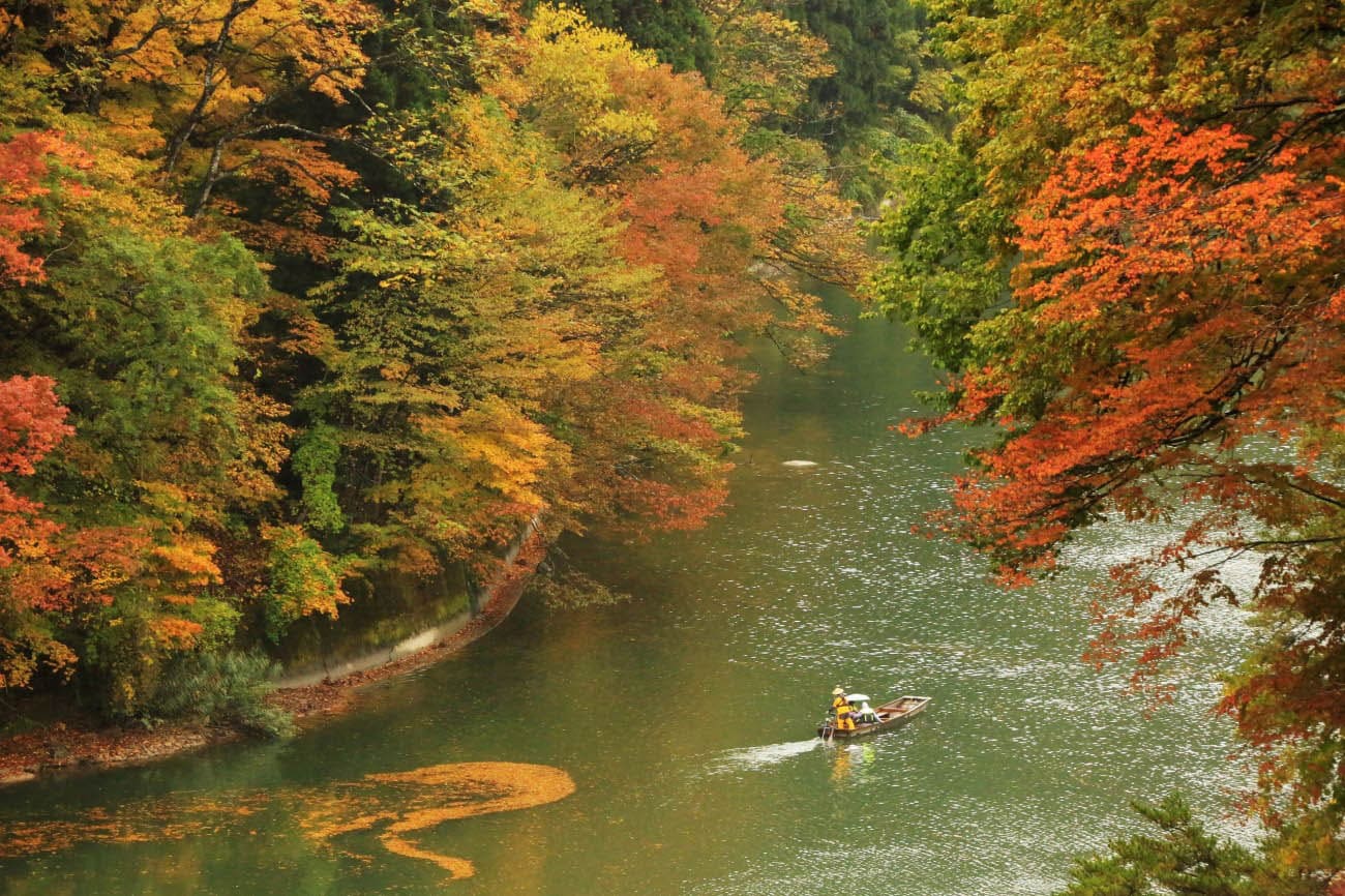 ส่วนในช่วงฤดูใบไม้ร่วง ทิวทัศน์ตลอดสองข้างทางของแม่น้ำจะกลายเป็นสีส้มแดง ใบไม้เปลี่ยนสีเหล่านี้จะสะท้อนบนผิวน้ำ ย้อมแม่น้ำทาดามิให้ออกมาเป็นสีส้มอ่อนๆ จึงเป็นอีกฤดูกาลหนึ่งที่ได้รับความนิยม นอกจากนี้เรือไม้ที่พาเราข้ามฟากนั้น ในอดีตยังเป็นเรือที่ใช้รับส่งชาวบ้านข้ามฝั่งแม่น้ำทาดามิมาเป็นเวลายาวนานกว่า 300 ปี และคนขับเรือยังแต่งตัวให้เข้ากับบรรยากาศ ทำให้เรารู้สึกราวกับได้ย้อนอดีตอีกด้วย