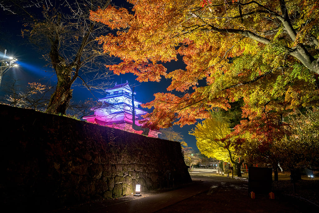 ในช่วงฤดูใบไม้ร่วง ปราสาทจะถูกล้อมรอบด้วยต้นเมเปิ้ลสีแดงสดและจัดแสดงไลท์อัพให้ชมในยามค่ำ เมื่อขึ้นไปถึงยอดปราสาท เราจะได้เปิดมุมมอง 360 องศาของเมืองและทิวเขารอบๆ นอกจากนี้บริเวณด้านล่างยังมีเรือนน้ำชาและร้านขนมของฝากมากมาย
