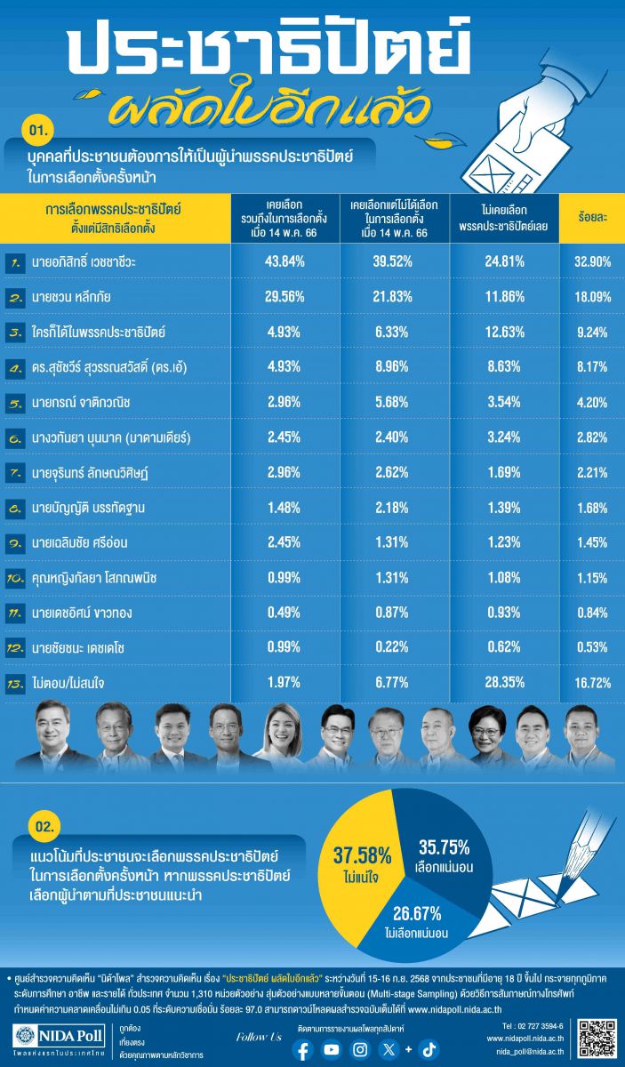 ศูนย์สำรวจความคิดเห็น “นิด้าโพล” สถาบันบัณฑิตพัฒนบริหารศาสตร์ (นิด้า) เปิดเผยผลการสำรวจ เรื่อง “ประชาธิปัตย์ ผลัดใบอีกแล้ว” ทำการสำรวจระหว่างวันที่ 15-16 กันยายน 2568 จากประชาชนที่มีอายุ 18 ปีขึ้นไป กระจายทุกภูมิภาค ระดับการศึกษา อาชีพ และรายได้ ทั่วประเทศ รวมจำนวนทั้งสิ้น 1,310 หน่วยตัวอย่าง เกี่ยวกับการเลือกผู้นำพรรคประชาธิปัตย์ที่ประชาชนต้องการในการเลือกตั้งครั้งหน้า การสำรวจอาศัยการสุ่มตัวอย่างโดยใช้ความน่าจะเป็นจากบัญชีรายชื่อฐานข้อมูลตัวอย่างหลัก (Master Sample) ของ “นิด้าโพล” สุ่มตัวอย่างแบบหลายขั้นตอน (Multi-stage Sampling) เก็บข้อมูลด้วยวิธีการสัมภาษณ์ทางโทรศัพท์ โดยกำหนดค่าความคลาดเคลื่อนไม่เกิน 0.05 ที่ระดับความเชื่อมั่น ร้อยละ 97.0