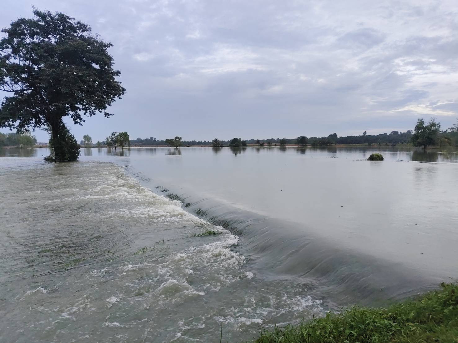 มวลน้ำจากเทือกเขาพนมดงรักล้นอ่างฯ กัดเซาะถนนหมู่บ้านขาดเตือนเฝ้าระวัง