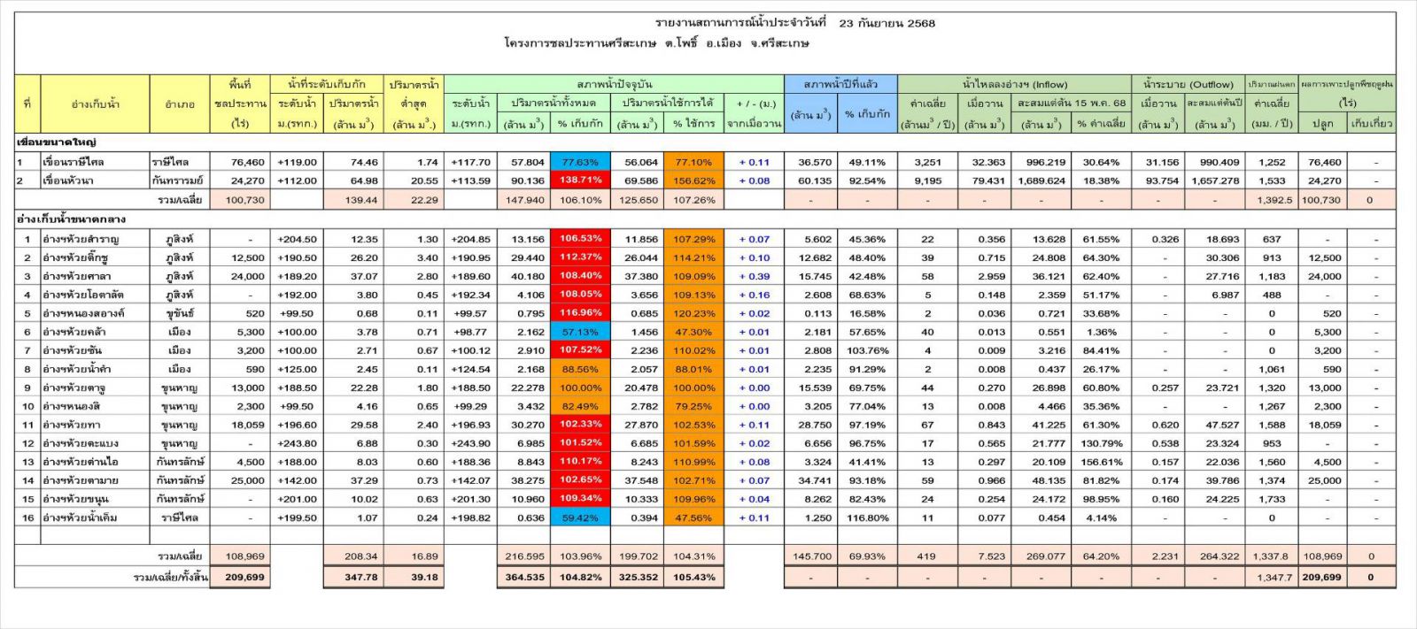 เมื่อวันที่ 23 กันยายน 2568 ผู้สื่อข่าวรายงานว่า ข้อมูลจากโครงการชลประทานศรีสะเกษ รายงานสถานการณ์น้ำในพื้นที่ จ.ศรีสะเกษ ในขณะนี้พบว่า เขื่อนขนาดใหญ่ 2 แห่ง คือ เขื่อนราษีไศล อ.ราษีไศล และเขื่อนหัวนา อ.กันทรารมย์ ปริมาณน้ำเก็บกัก 139.44 ล้าน ลบ.ม. ปัจจุบัน 147.94 ล้าน ลบ.ม. คิดเป็น 106.10% ของความจุ ส่วนอ่างเก็บน้ำขนาดกลาง จำนวน 16 แห่ง ปริมาณน้ำเก็บกัก 208.34 ล้าน ลบ.ม. ปัจจุบัน 216.59 ล้าน ลบ.ม. คิดเป็น 103.96% ส่งผลทำให้อ่างเก็บน้ำหลายแห่งมีปริมาณน้ำเกินกว่าความจุเก็บกัก 100% แล้วจำนวน 11 แห่ง และล้นสปรินเวย์