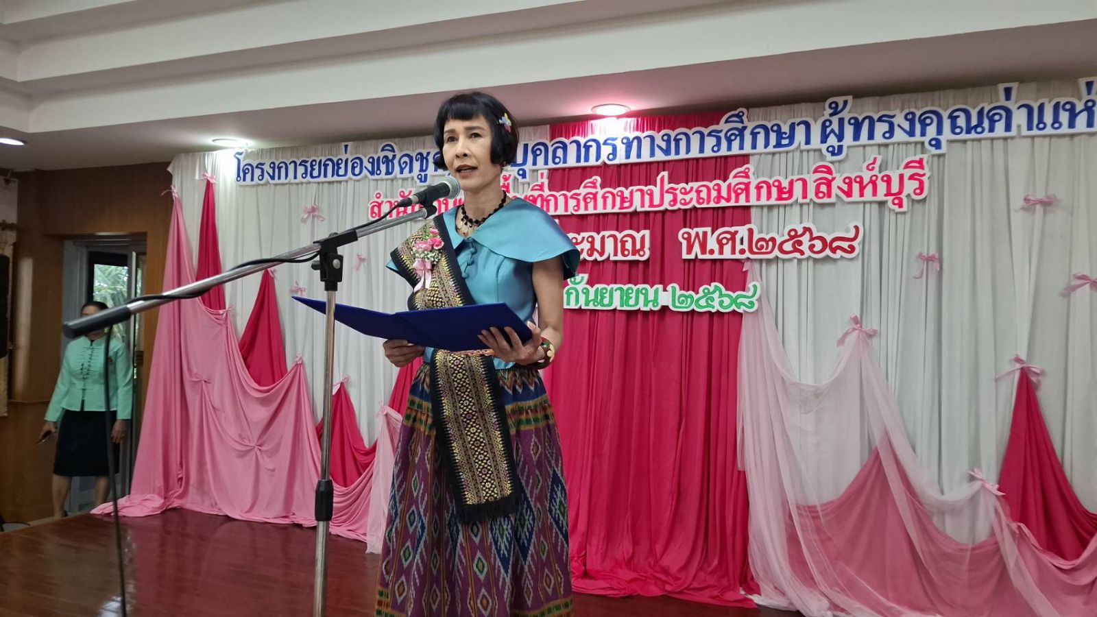สิงห์บุรี-วันอังคารที่ 23 กันยายน 2568 เวลา 07.00 น. ดร.เกตุชญา วงษ์เพิก ผู้อำนวยการสำนักงานเขตพื้นที่การศึกษาประถมศึกษาสิงห์บุรี ประธานในพิธี พร้อมด้วย ดร.กมลทิพย์ ใจเที่ยง นางจิราวัฒน์ คุณเวียน และ นายรังสฤษดิ์ บุตรลักษ์ รองผู้อำนวยการสำนักงานเขตพื้นที่การศึกษาประถมศึกษาสิงห์บุรี ได้กล่าวรายงานวัตถุประสงค์การจัดกิจกรรมและรายละเอียดของการยกย่องเชิดชูครูและบุคลากรทางการศึกษาผู้ทรงคุณค่าแห่งวิชาชีพ ประจำปีงบประมาณ พ.ศ. 2568