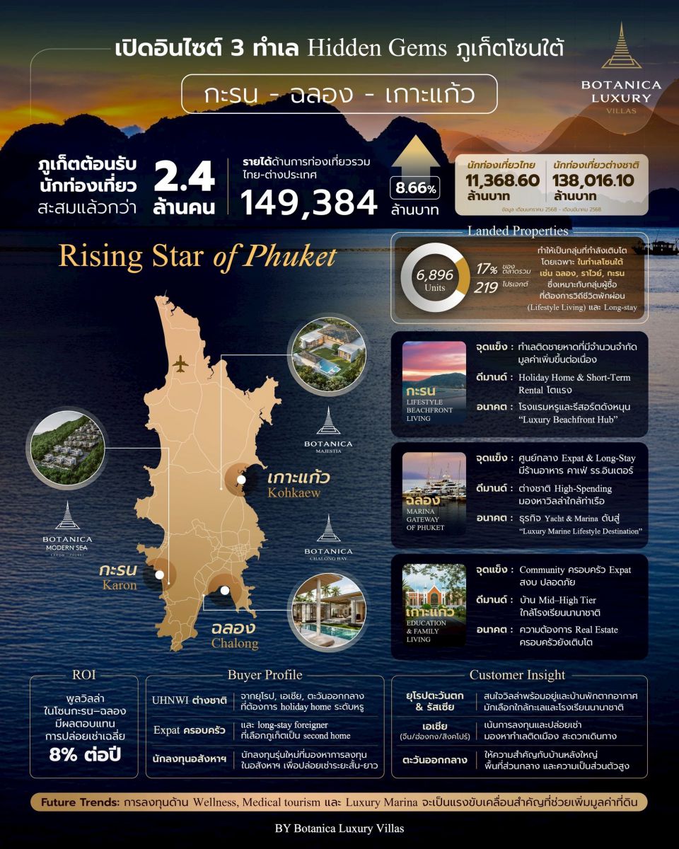 ภูเก็ต 23 กันยายน 2568 -จังหวัดภูเก็ตในวันนี้ไม่ได้เป็นเพียงเกาะท่องเที่ยวระดับโลกที่มีชื่อเสียงเรื่องหาดทรายและทะเลอันดามันเท่านั้น แต่กำลังกลายเป็น "จุดหมายด้านการลงทุนอสังหาริมทรัพย์หรู" ที่นักลงทุนต่างชาติ รวมถึงผู้ซื้อระดับบนจากเมืองไทยและทั่วโลกจับตามอง โดย โบทานิก้า ลักซูรี่ วิลล่า ผู้พัฒนาพูลวิลล่าลักชัวรีอันดับหนึ่งของภูเก็ตด้วยประสบการณ์กว่า 20 ปี เล่าว่าปีนี้ภูเก็ตกลับมาคึกคักอย่างมาก จากข้อมูลโดยสมาคมธุรกิจการท่องเที่ยวจังหวัดภูเก็ต ภูเก็ตมีนักท่องเที่ยวสะสมกว่า 2.4 ล้านคน โดยรวมโต 8% ในปีนี้ (ตั้งแต่วันที่ 1 มกราคม – 31 พฤษภาคม 2568) พร้อมรายได้ด้านการท่องเที่ยวรวม 149,384 ล้านบาท เติบโต 8.66% จากปีก่อน ในขณะเดียวกัน กลุ่มตลาด Long-stay และ Digital Nomad รวมถึงกลุ่ม Ultra-High Net Worth Individuals (UHNWI) ที่ยกให้ภูเก็ตเป็นบ้านหลังที่สอง ก็เติบโตสูงขึ้นอย่างต่อเนื่อง