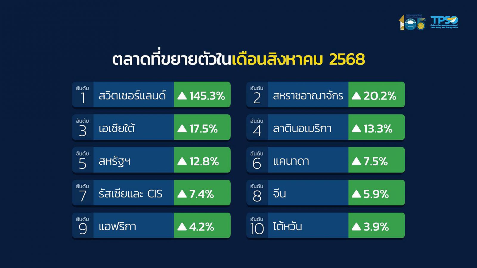 นายพูนพงษ์ นัยนาภากรณ์ ผู้อำนวยการสำนักงานนโยบายและยุทธศาสตร์การค้า (สนค.) โฆษกกระทรวงพาณิชย์ แถลงการส่งออกของไทยในเดือนสิงหาคม 2568 มีมูลค่า 27,743.2 ล้านดอลลาร์สหรัฐ (889,014 ล้านบาท) ขยายตัวต่อเนื่องเป็นเดือนที่ 14 ที่ร้อยละ 5.8 หากหักสินค้าเกี่ยวเนื่องกับน้ำมัน ทองคำ และยุทธปัจจัย ขยายตัวที่ร้อยละ 5.4 การส่งออกขยายตัวในอัตราชะลอลงมากขึ้น หลังจากมีการบังคับใช้อัตราภาษีศุลกากรต่างตอบแทนของสหรัฐฯ ตั้งแต่ช่วงต้นเดือนสิงหาคม ผู้นำเข้าส่วนใหญ่มีความชัดเจนขึ้นเกี่ยวกับการวางแผนจัดการความเสี่ยงด้านราคา แม้ว่าระดับสินค้าคงคลังในสหรัฐฯ จะเริ่มมีทิศทางเพิ่มขึ้น เนื่องจากอุปสงค์ที่อ่อนแอ แต่ยังคงเห็นการขยายตัวในกลุ่มสินค้าอิเล็กทรอนิกส์และเครื่องใช้ไฟฟ้าอย่างต่อเนื่อง ขณะที่สินค้าเกษตรได้รับแรงกดดันจากการแข่งขันด้านราคา อาทิ ข้าว ยางพารา และมันสำปะหลัง ทั้งนี้ การส่งออก 8 เดือนแรกของปี 2568 ขยายตัวที่ร้อยละ 13.3 หากหักสินค้าเกี่ยวเนื่องกับน้ำมัน ทองคำ และยุทธปัจจัย ขยายตัวที่ร้อยละ 13.3