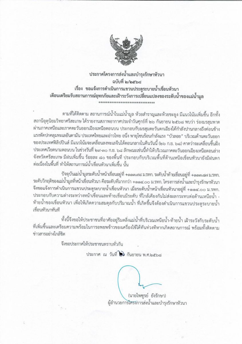 เมื่อวันที่ 26 ก.ย. 2568 นายไพฑูรย์ ยังรักษา ผอ.โครงการส่งน้ำและบำรุงรักษาหัวนา (เขื่อนหัวนา) เปิดเผยว่า ตามที่ได้ติดตามสถานการณ์น้ำในแม่น้ำมูล ลำน้ำห้วยสำราญ และห้วยขะยูง มีแนวโน้มเพิ่มขึ้น อีกทั้งสถานีอุตุนิยมวิทยาศรีสะเกษ ได้รายงานสภาพอากาศประจำวันศุกร์ที่ 26 กันยายน 2568 พบว่า ร่องมรสุมพาดผ่านภาคเหนือและภาคตะวันออกเฉียงเหนือตอนบน ประกอบกับมรสุมตะวันตกเฉียงใต้กำลังปานกลางถึงค่อนข้างแรง พัดปกคลุมทะเลอันดามัน ประเทศไทยและอ่าวไทย อีกทั้ง พายุโซนร้อนกำลังแรง “บัวลอย” บริเวณต้านตะวันออกของประเทศฟิลิปปินส์ มีแนวโน้มจะเคลื่อนลงทะเลจีนใต้ตอนกลางในคืนวันนี้ (26 ก.ย. 68)