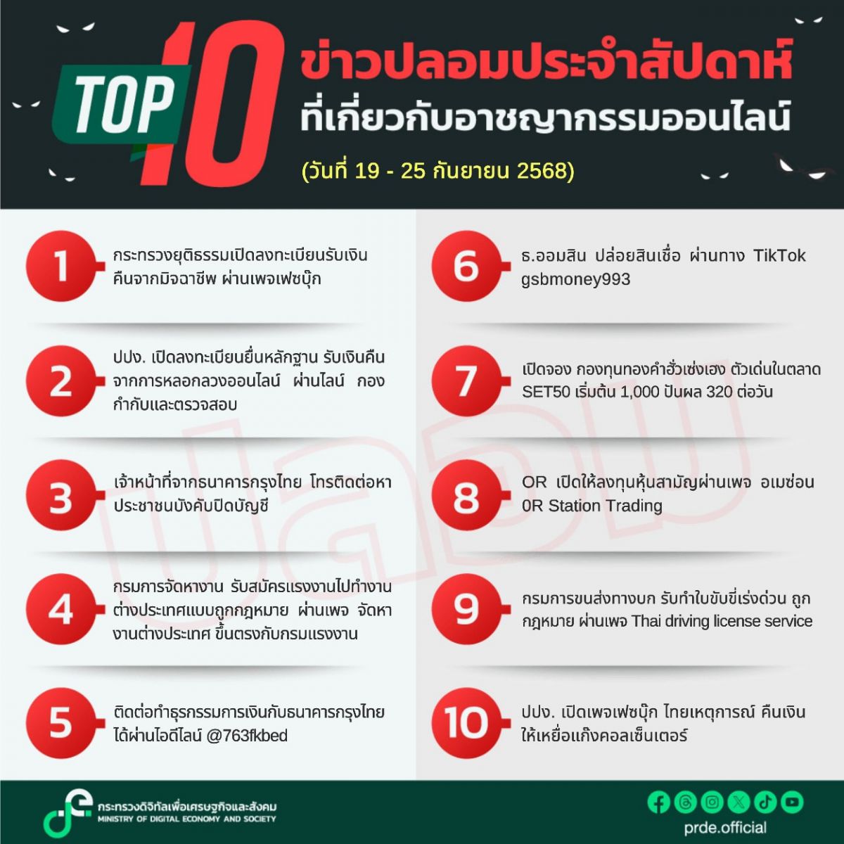 สำหรับอันดับ 1 เรื่อง “กระทรวงยุติธรรมเปิดลงทะเบียนรับเงินคืนจากมิจฉาชีพ ผ่านเพจเฟซบุ๊ก” กระทรวงดีอี ประสานงานร่วมกับ สำนักงานปลัดกระทรวงยุติธรรม กระทรวงยุติธรรม ตรวจสอบพบว่าเป็นข้อมูลเท็จ และขอชี้แจงว่า ตามที่ได้มีการนําเสนอในประเด็นเรื่อง กระทรวงยุติธรรม เปิดเพจเฟซบุ๊กชื่อ Solve online crime problems ลงทะเบียนรับเงินคืนจากมิจฉาชีพ โดยใช้รูปโปรไฟล์เป็นโลโก้ กระทรวงยุติธรรม โดยจากการตรวจสอบลักษณะการกระทําดังกล่าว พบว่า เพจเฟซบุ๊กดังกล่าวไม่ใช่เพจของกระทรวงยุติธรรม ซึ่งมีลักษณะเป็นการแอบอ้างเพื่อสร้างความน่าเชื่อถือให้เสมือนเป็นเพจของกระทรวงยุติธรรมจริง ซึ่งเป็นการหลอกลวงประชาชน และเป็นการนําเสนอข้อมูลที่ไม่เป็นความจริง ขอประชาชนอย่าหลงเชื่อและอย่าโอนเงินไป เพื่อป้องกันความเสียหาย