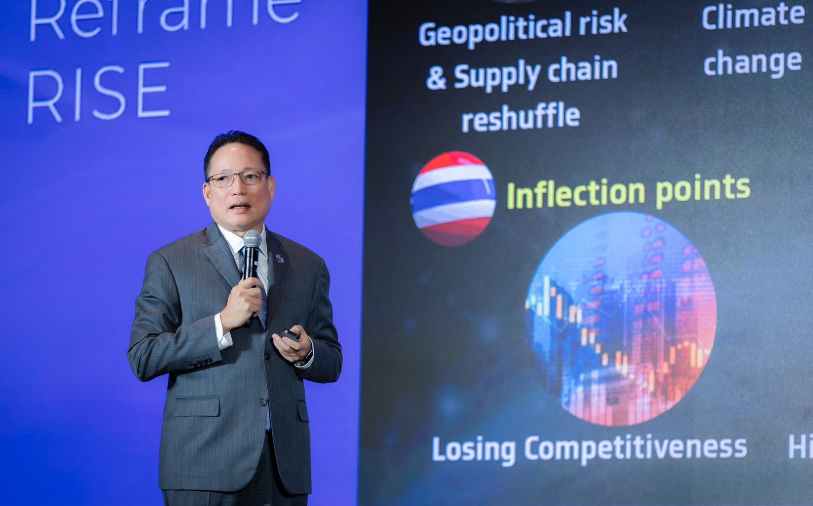 2.ขาดความสามารถในการแข่งขันในโลกใหม่ โดยเศรษฐกิจไทยเติบโตตามหลังประเทศเพื่อนบ้าน ทำให้เงินไทยไหลออกไปลงทุนในต่างประเทศต่อเนื่อง ขณะที่การลงทุนโดยตรงจากต่างประเทศ (FDI) ต่ำกว่าประเทศเพื่อนบ้าน 3.ความท้าทายของภาครัฐ กฎระเบียบจำนวนมากถึงกว่า 100,000 ฉบับ บางส่วนล้าสมัยและซ้ำซ้อน อีกทั้ง ข้อมูลของภาครัฐยังไม่เชื่อมโยงกัน