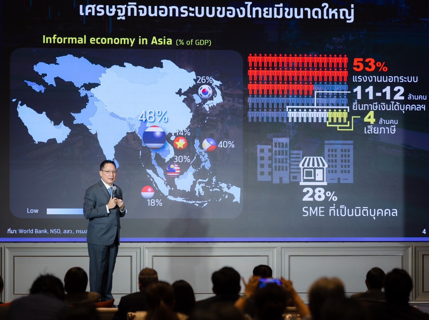 นายผยงกล่าวว่า เศรษฐกิจไทยในระยะข้างหน้า เผชิญความท้าทายใน 3 ด้านคือ 1. ความเปราะบางเชิงโครงสร้าง โดยประเทศไทยยังมีเศรษฐกิจนอกระบบสูงเป็นลำดับต้นๆ ในเอเชียที่ราว 48% ของ GDP ทำให้รัฐจัดเก็บภาษีได้จำกัดและส่งเสริมการพัฒนาได้ไม่ทั่วถึง อีกทั้ง หนี้ครัวเรือนอยู่ในระดับสูง เมื่อรวมหนี้นอกระบบ เกิน 100% ของ GDP ขณะที่ข้อมูลหนี้ในระบบไม่สมบูรณ์ บางส่วนยังไม่มีอยู่ในฐานข้อมูลเครดิตของ NCB
