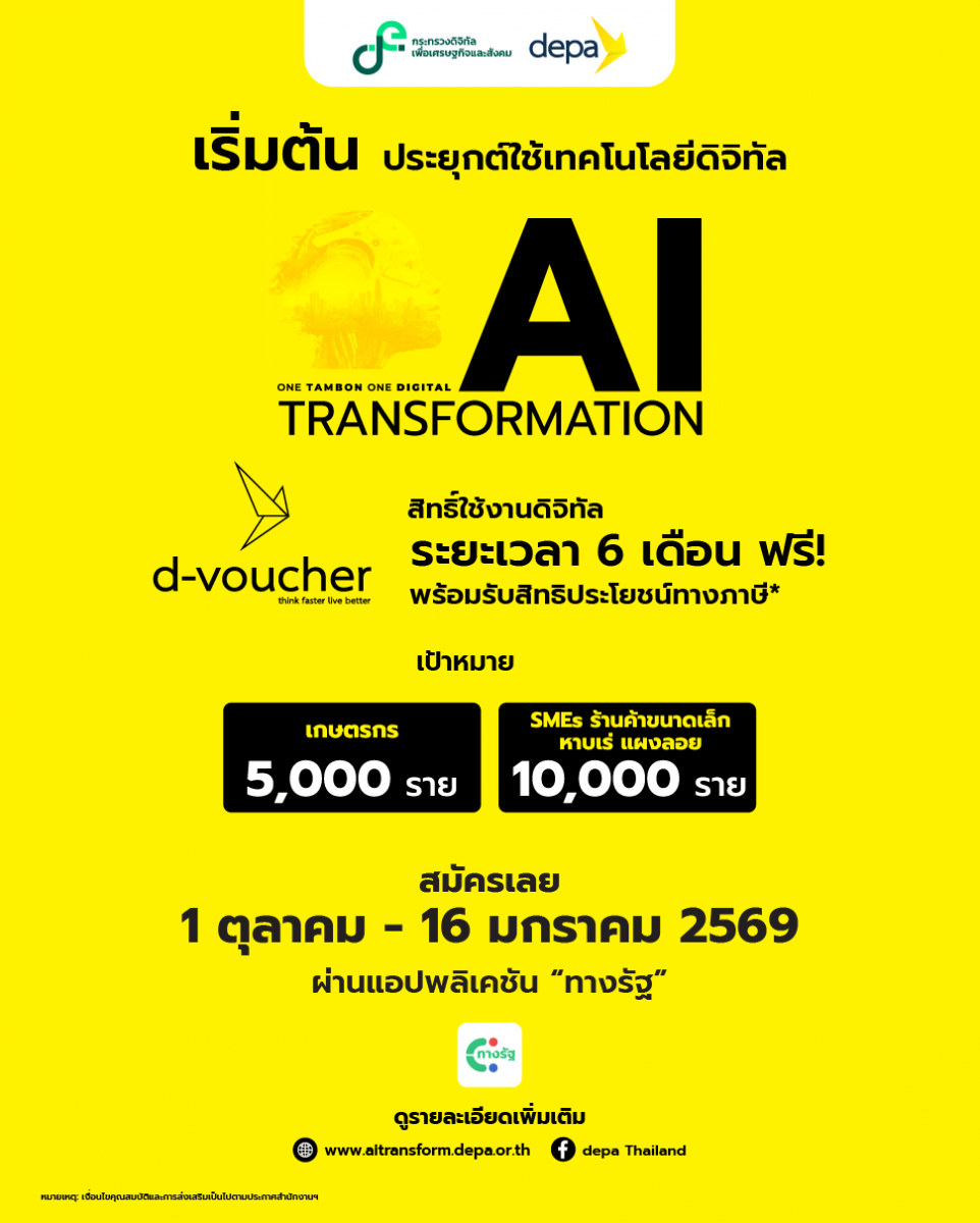ผศ.ดร.ณัฐพล นิมมานพัชรินทร์ ผู้อำนวยการใหญ่ สำนักงานส่งเสริมเศรษฐกิจดิจิทัล หรือ ดีป้า เปิดเผยว่า การส่งเสริมผ่านโครงการ AI Transformation แบ่งออกเป็น 2 รูปแบบ โดยหนึ่งในนั้นคือ การส่งเสริมการเริ่มต้นใช้งานดิจิทัลตามมาตรการ d-voucher โดย ดีป้า จะมอบสิทธิ์การใช้ดิจิทัลโดยไม่มีค่าใช้จ่าย ระยะเวลาอย่างน้อย 6 เดือนแก่ผู้ประกอบการ SMEs ผู้ประกอบการรายย่อย ร้านค้า หาบเร่ แผงลอย ตลาดสด รวม 10,000 ราย และเกษตรกร จำนวน 5,000 ราย