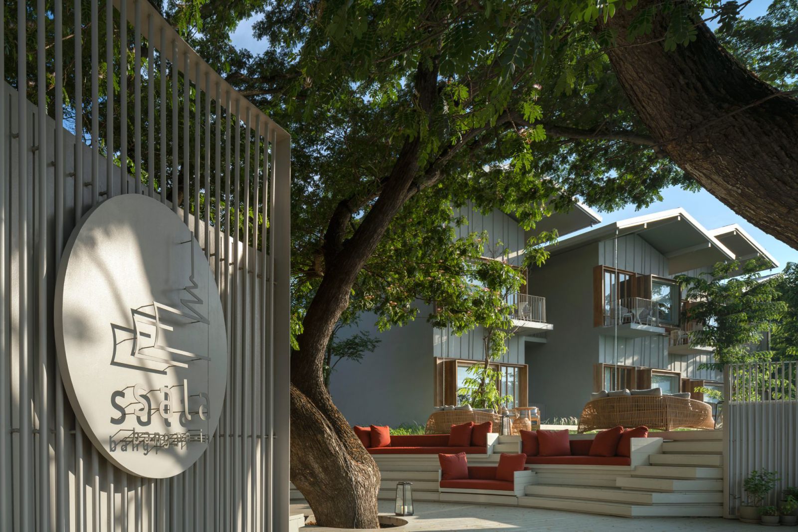 ศาลาบางปะอิน บูติกรีสอร์ทหนึ่งเดียวที่ตั้งอยู่บนเกาะส่วนตัวกลางแม่น้ำเจ้าพระยา จังหวัดพระนครศรีอยุธยา ใกล้พระราชวังบางปะอิน สถานที่ที่มีประวัติศาสตร์ยาวนานกว่า 390 ปี โดยมีห้องพักและพูลวิลล่ารวม 24 ห้อง ออกแบบภายใต้แนวคิด “Historical Getaway” นำภูมิทัศน์ชนบทของอยุธยามาผสานเข้ากับการดีไซน์ร่วมสมัย สร้างสรรค์จากวัสดุท้องถิ่นต่างๆ อย่างผ้าโปร่ง อิฐ ไม้ธรรมชาติ และงานจักสาน มอบบรรยากาศที่เรียบง่ายผ่อนคลาย และเป็นกันเอง โดยตัวอาคารได้รับการออกแบบให้มีขนาดสอดคล้องกับบ้านเรือนโดยรอบ โอบล้อมด้วยต้นไม้เขียวขจี และต้นจามจุรีสูงใหญ่ที่ได้รับการอนุรักษ์ไว้เป็นอย่างดี ควบคู่กับการมอบความสะดวกสบายและฟังก์ชันการใช้งานที่ทันสมัยครบครัน แขกที่มาเยือนจะได้รับการต้อนรับบริเวณพื้นที่ล็อบบี้ที่โปร่งสบาย แต่งแต้มด้วยสีแดงอันสดใส ใต้อาคารไม้ยกพื้นสูง พร้อมด้วยแลนด์มาร์กสำคัญที่กลายเป็นสัญลักษณ์ประจำบูติกรีสอร์ทแห่งนี้ คือสะพานสีแดงทอดข้ามแม่น้ำ ที่มีสีสันโดดเด่น แต่ก็กลมกลืนไปกับบริบทของหมู่บ้าน ทำหน้าที่เชื่อมพื้นที่สองฝั่ง และแฝงถึงการเชื่อมโยงระหว่างสถาปัตยกรรมสมัยใหม่กับวิถีชุมชนท้องถิ่นริมฝั่งน้ำได้เป็นอย่างดี