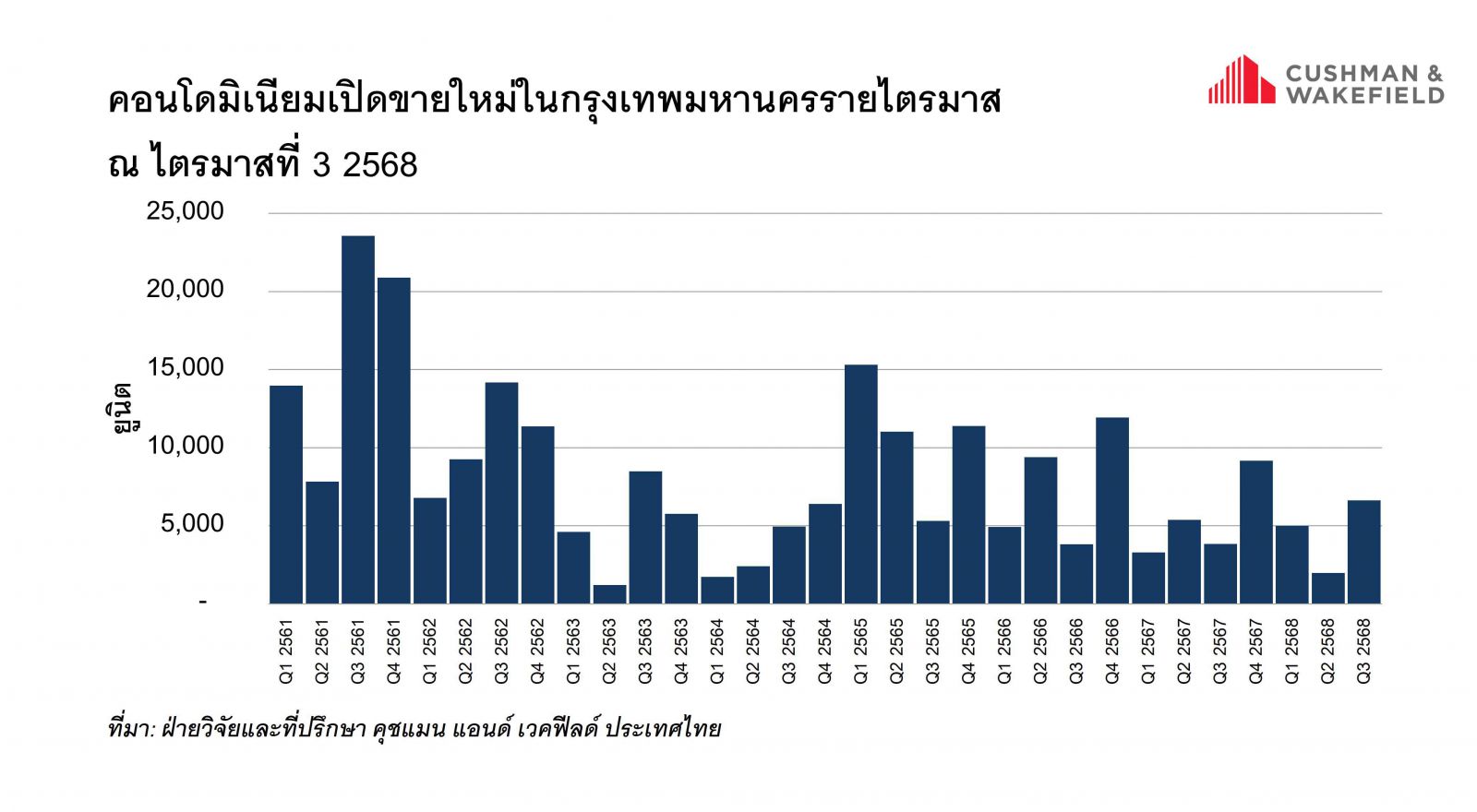 นายสุรเชษฐ กองชีพ หัวหน้าฝ่ายวิจัยและที่ปรึกษา คุชแมน แอนด์ เวคฟีลด์ ประเทศไทย เปิดเผยว่า ในช่วงครึ่งแรกของปี 2568 มีโครงการคอนโดมิเนียมเปิดขายใหม่ไม่มากนัก แต่ ช่วงไตรมาส 3/2568 ที่ผ่านมา เริ่มมีโครงการคอนโดมิเนียมเปิดขายใหม่มากขึ้น และที่น่าสนใจ คือ หลายโครงการเป็นโครงการคอนโดมิเนียมที่มีราคาขายค่อนข้างสูง โดยมีคอนโดมิเนียมเปิดขายใหม่ในไตรมาส 3/2568 ทั้งหมดประมาณ 6,618 ยูนิต และข้อมูลที่น่าสนใจพบว่าหลายโครงการเปิดขายโดยไม่ได้ประกาศขาย (Presale) แบบเป็นทางการ แต่เปิดขายในลักษณะให้จองบางชั้นก่อนเพื่อทดลองตลาดดูว่าได้รับความสนใจมากน้อยเพียงใด จากนั้นจึงเปิดขายแบบเป็นทางการหลังจากช่วงเวลาดังกล่าวไม่นาน นอกจากนี้มี หลายโครงการเปิดขายในเดือนกันยายน ซึ่งอาจจะมีผลให้ภาพรวมตลาดคอนโดมิเนียมในไตรมาส 3 ดูไม่คึกคักเท่าที่ควร เพราะในช่วงเดือนกรกฎาคม และเดือน สิงหาคม มีโครงการเปิดขายใหม่จำนวนน้อย มีบางคอนโดมิเนียมบางโครงการเปิดขายในช่วงที่ผ่านมาได้รับความสนใจจากผู้ซื้อทั่วไปและนักลงทุนมากกว่าโครงการอื่นๆ แบบชัดเจน เพราะด้วยทำเลที่ตั้งและราคาที่ไม่สูงเกินไป