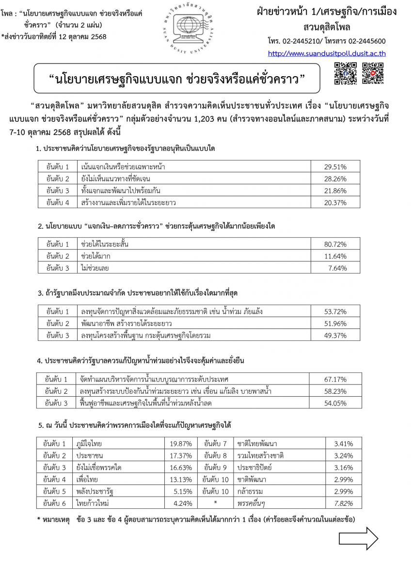 12 ตุลาคม 2568 “สวนดุสิตโพล” มหาวิทยาลัยสวนดุสิต สำรวจความคิดเห็นประชาชนทั่วประเทศ เรื่อง “นโยบายเศรษฐกิจแบบแจก ช่วยจริงหรือแค่ชั่วคราว” กลุ่มตัวอย่าง จำนวน 1,203 คน (สำรวจทางออนไลน์และภาคสนาม) ระหว่างวันที่ 7-10 ตุลาคม 2568 พบว่า