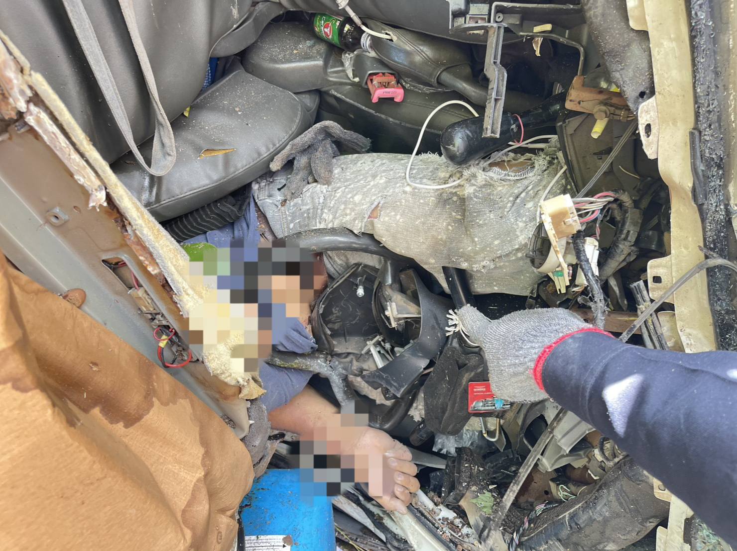 เป็นถนนทางแคบ 2 ช่องทางการจราจรรถวิ่งสวนเลน ทางตรงข้างไหล่ทางพบรถกระบะสีขาวตกถนนพุ่งชนต้นไม้ใหญ่ช้างทางต้นเกือบเท่าคนโอบจนโคนถนนตะแคงข้างล้ออีกฟากลอยสภาพหลังคารถยุบเข้าหาตัวรถที่พื้นด้านล่างถังแกลลอนที่บรรทุกน้ำยา(ไม่ทราบชนิด)ใส่มาท้ายกระบะตกกระจายเกลื่อน ตรวจสอบที่นั่งคนขับพบผู้ขับขี่มาลำพังเสียชีวิตคาที่สภาพถูกแรงกระแทกอัดก๊อปปี๊คาพวงมาลัยกู้ภัยฯต้องช่วยงัดเอาร่างออกมาทราบชื่อผู้เสียชีวิตต่อมาคือนายดุสิต (ขอสงวนนามสกุล) อายุ 56 ปี ชาว ต.ลาดตะเคียน อ.กบินทร์บุรี จ.ปราจีนบุรี